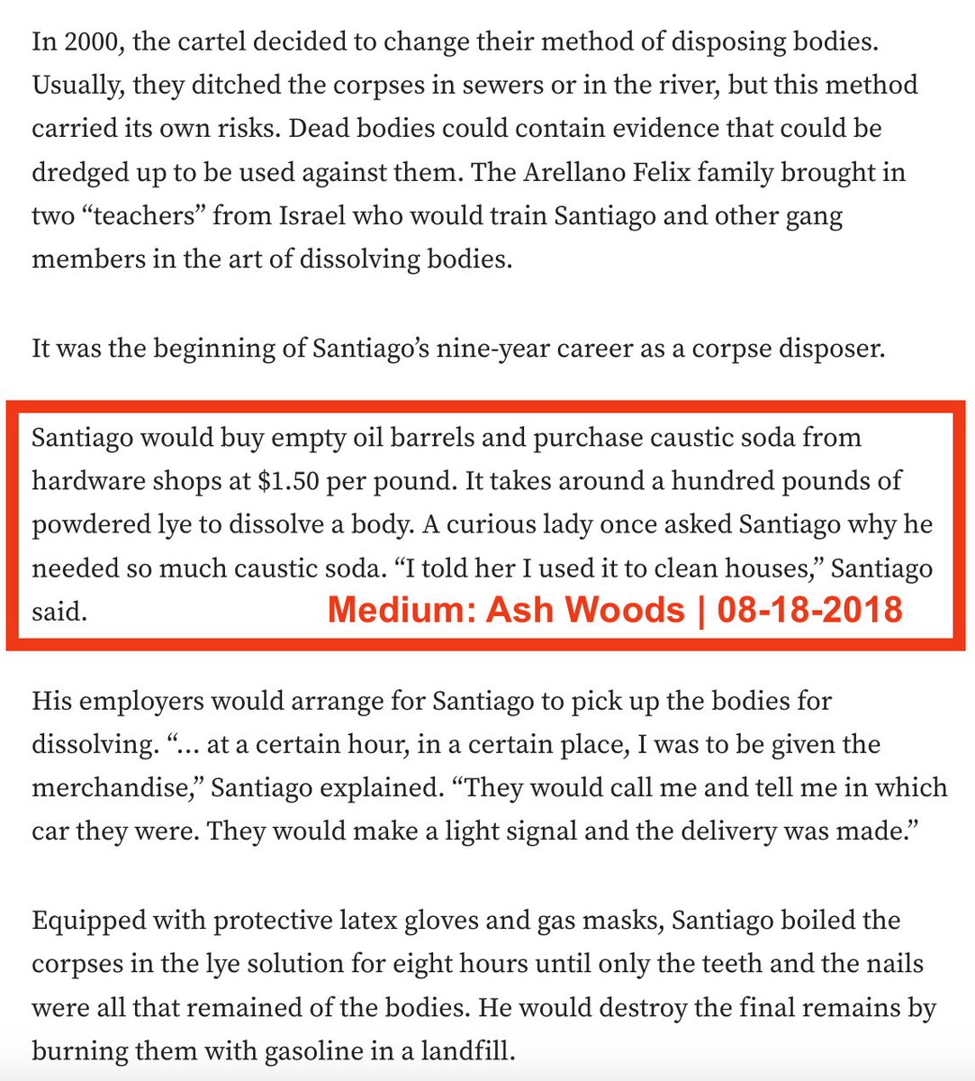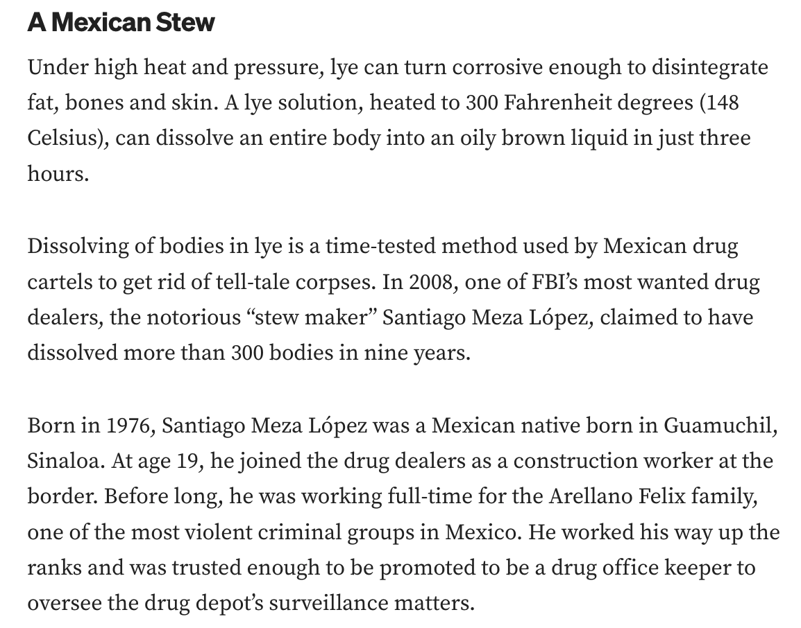 The Mexican Stew: How Mexican cartels were trained in Israel on how to dissolve bodies in acid. https://medium.com/the-crime-historian/the-story-of-lye-the-cook-the-murderer-his-wife-and-her-lover-187d29c92352