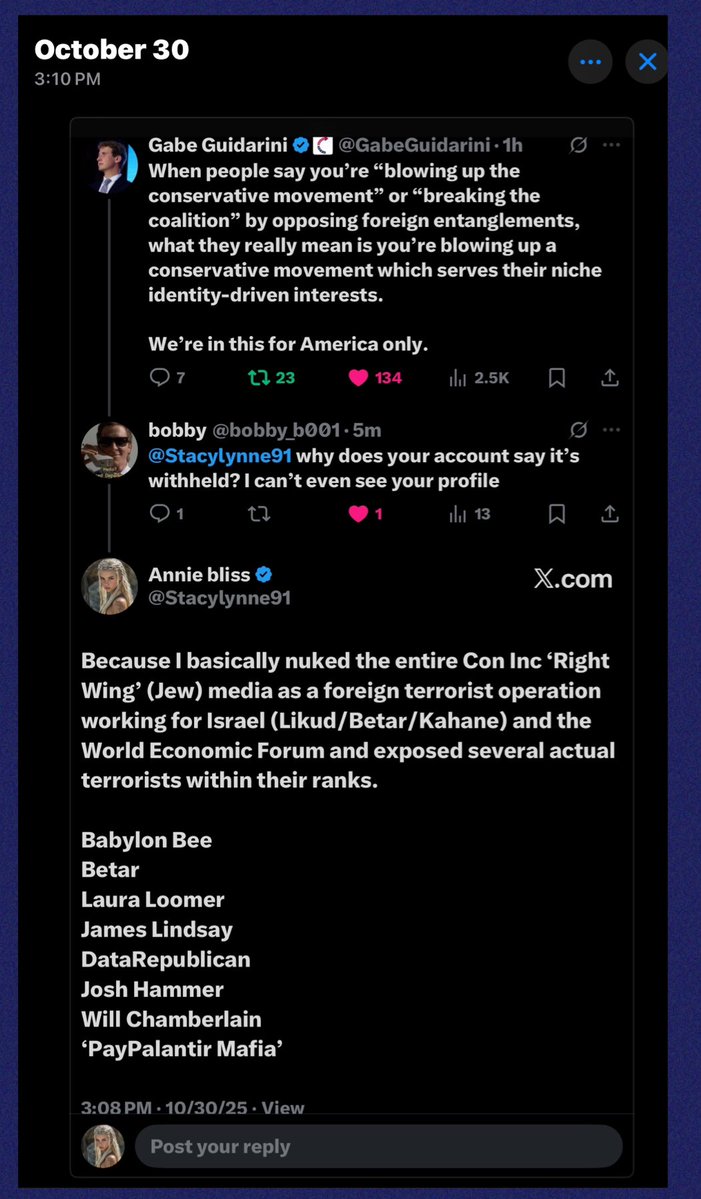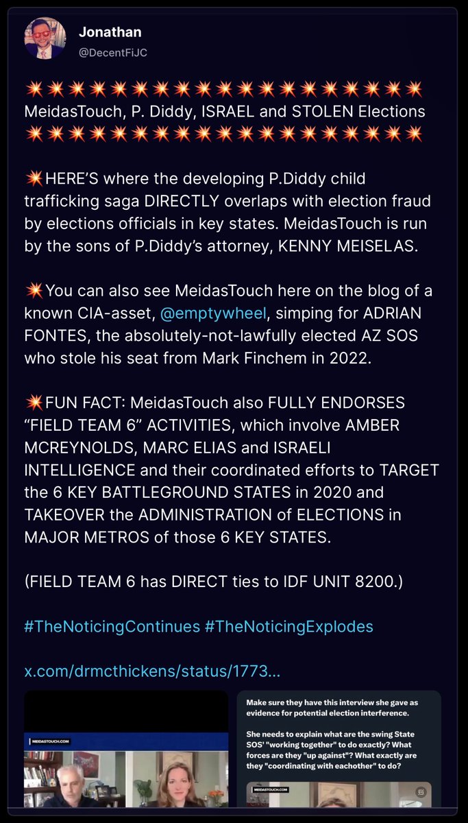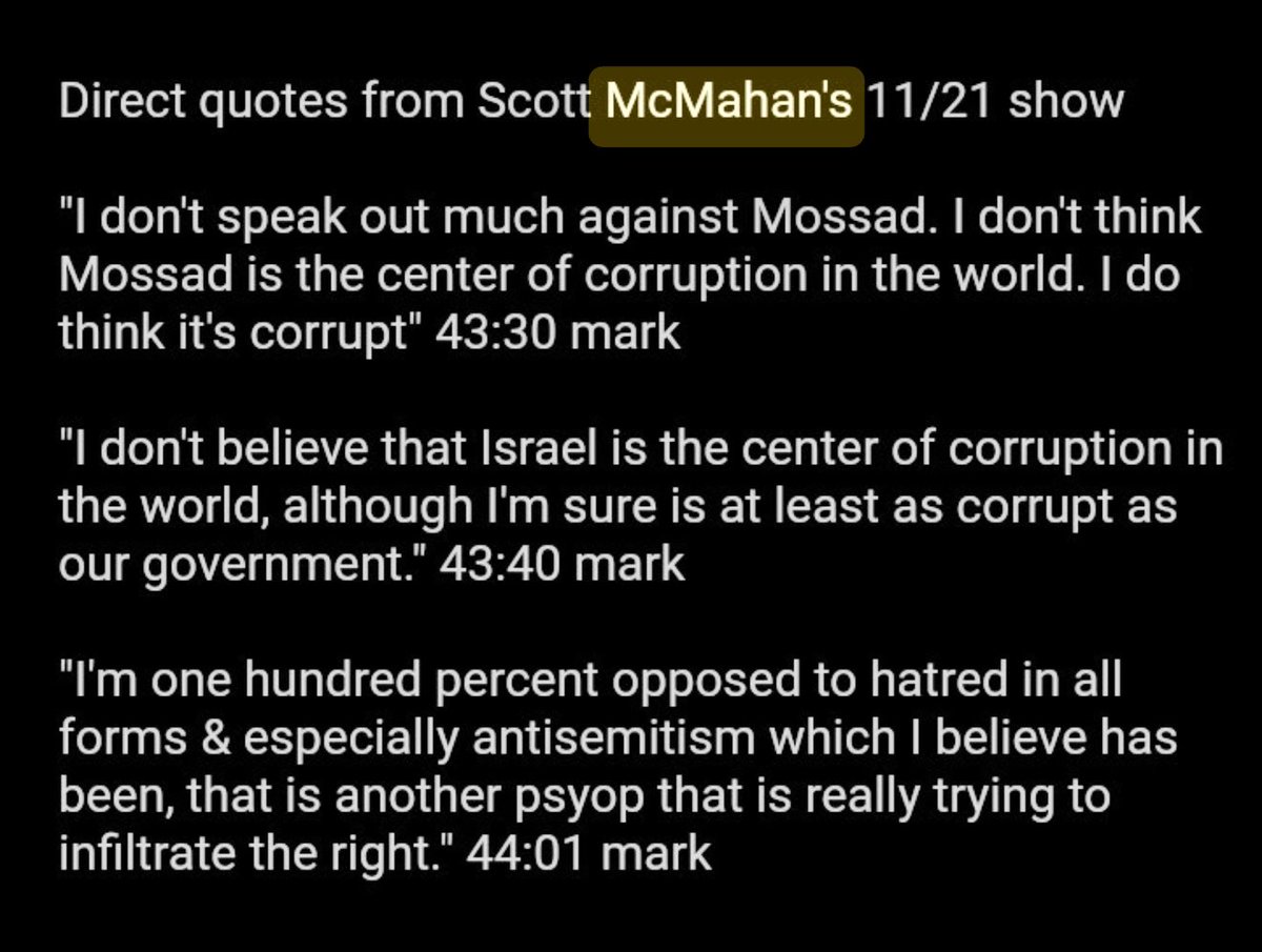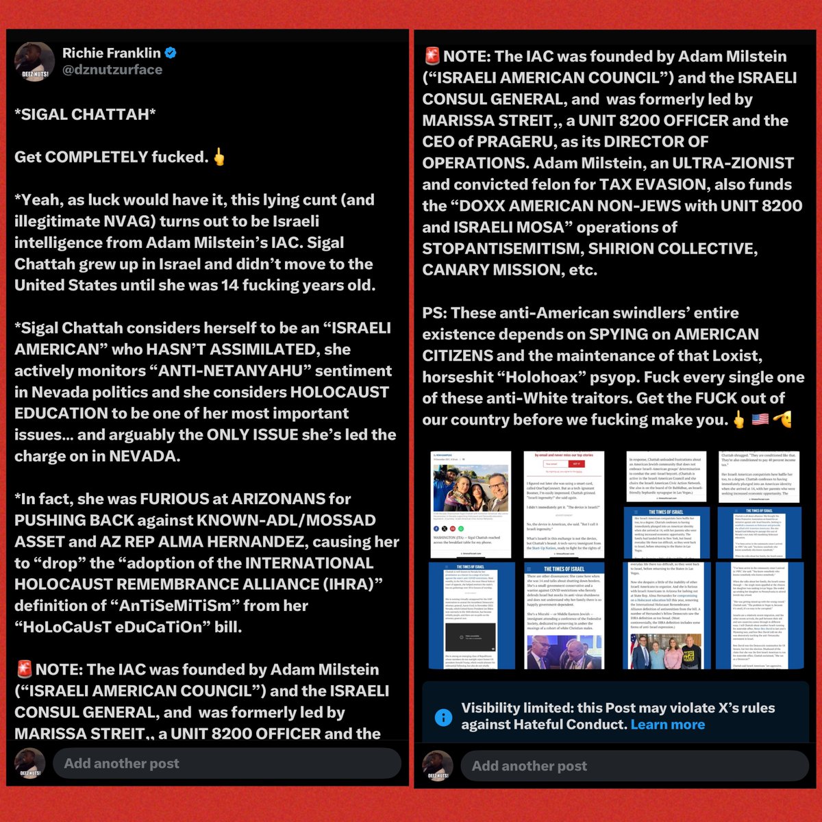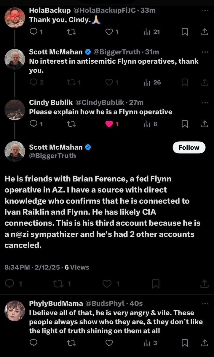 1. I don’t have Brian Ference’s phone number and I don’t remember ever meeting the guy even once, unless it was at some group hangout Rachel Alexander organized when I was in AZ doing pro bono election integrity work in support of the stolen 2022 elections. I’ve maybe DM’ed him 5-6 times in my entire life. Couldn’t even begin to tell you when the last time that was, Scott. 2. I am in no way connected to Ivan Raiklin or Michael Flynn. All my proactive efforts to get information into their hands have been ignored. To my knowledge, the only interaction I’ve ever had with Flynn irl was the five minutes I met him at the symposium in Missouri in August 2023. *Online, Flynn has engaged a grand total of one post of mine ever, which was 3-4 days ago. Right before he blocked me for exposing his ties to OSY/NSO/Q Cyber, and those same entities’s involvement in a number of crimes (via their Pegasus software) WE uncovered, including election fraud, hacking financial markets and banking systems and defrauding retail investors in the FTX scam. *That same Missouri symposium is the one and only time I met Ivan Raiklin, whom I only met because he was standing beside someone I DO know and have worked with in the past, Kurt Olsen. Olsen was one of Kari Lake’s attorneys for the 2022 elections lawsuits. I also know Kari’s other attorneys, Bryan Blehm and Shelby Busch, and have worked with them too. For free. 3. I’m on my third account because criminals, who overwhelmingly tend to be Jews as purely a matter of objective fact, don’t like me exposing their criminal ties to kid trafficking, pedophilia, election fraud, stealing our nuclear secrets, shooting at our current President, etc. on this platform. Unfortunately for my account longevity, that’s something we do more of and at a much higher level than anybody else on this platform. 4. You don’t “have a source with direct knowledge who confirms” anything, because such a source simply doesn’t exist. And if a legitimate source DID exist, you’d have already named them. But we both know you won’t, because I’d ruin THAT bullshit narrative too… and I’d do it in less time than you’d need to read and recite whatever horseshit reply the Federal Reserve Bank fa***ts you and Lamb work for just ghostwrote for you. 5. “He has likely CIA connections.” Lol, and? I also ‘likely’ have U.S. DoE, NSA, DHS, FBI, USA/USN/USAF Intel connections too. Many/most of which, I don’t even know about. Because believe it or not, not EVERYBODY on the inside is a bad actor. And when you tend to be right, consistently, much earlier and at a volume, a depth and a level of detail nobody else on a platform of millions of people approaches, people on the inside who care enough about what’s happening to America to do something about it tend to reach out. *I’d wager I probably have a few Mossad connections too, some I probably even think are my friends, simply because I haven’t yet figured out they’re controlled ops and they’ve at least been clever enough to not fully unmask themselves to me so far. 6. Regardless of all the above, even if I WERE a “Nazi sympathizer”, so the fuck what? It’s my 1A right to sympathize with whomever the fuck I want. This is AMERICA. This isn’t ISRAEL. Or WEIMAR. Or anywhere else you might think ‘Jew opinions and liberties’ matter more than ‘Gentile opinions and liberties’. Hell, I could even sympathize with a crypto Jew like you, a sitting government official in a state not named “Arizona”, who works with Sinaloa assets like Lamb in a state named “Arizona”, and who makes shit up about honest, hard-working, deeply-affected people doing mountains of honest work (primarily) in a state named “Alabama”, but who is willing to go help other states whenever and wherever needed. For basically nothing. And do you know why that is, Scott? Because honest people who look, think and act like me fought and died in service of protecting that right for BOTH of us. (You’re getting more grace than you deserve.)