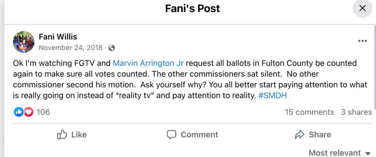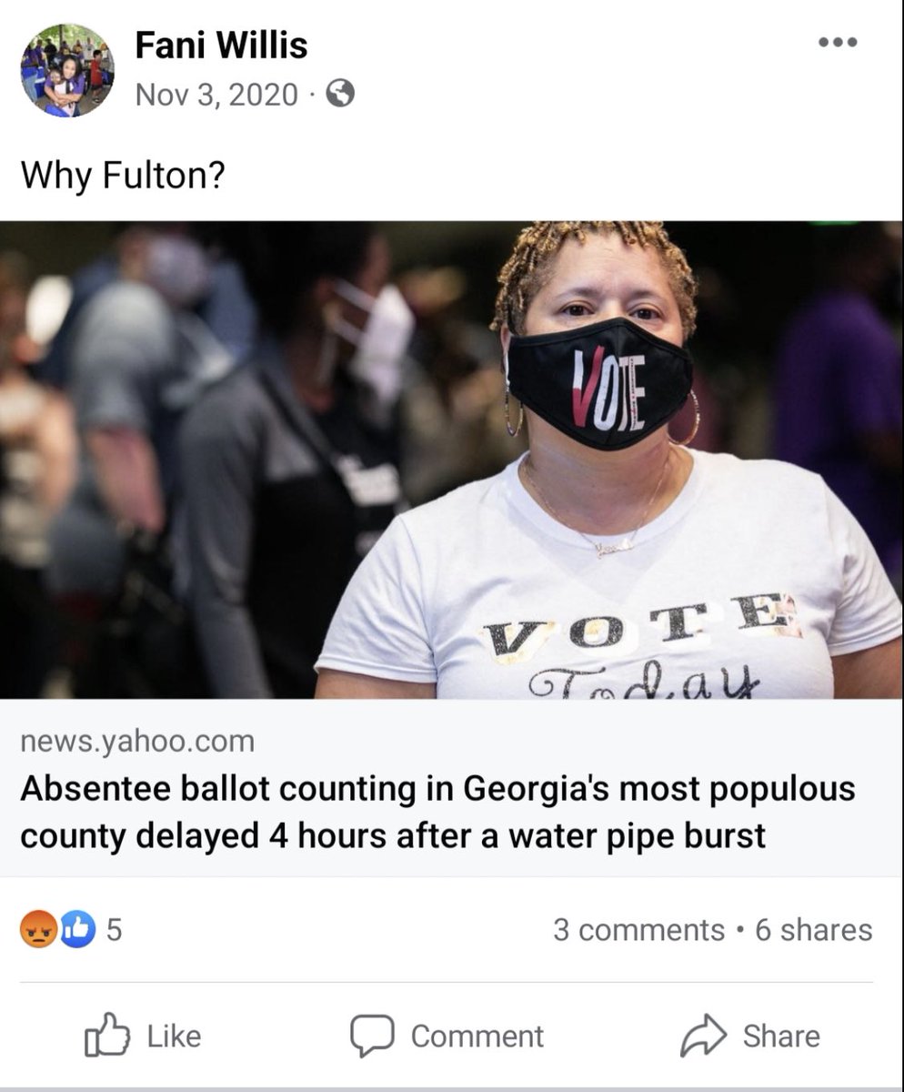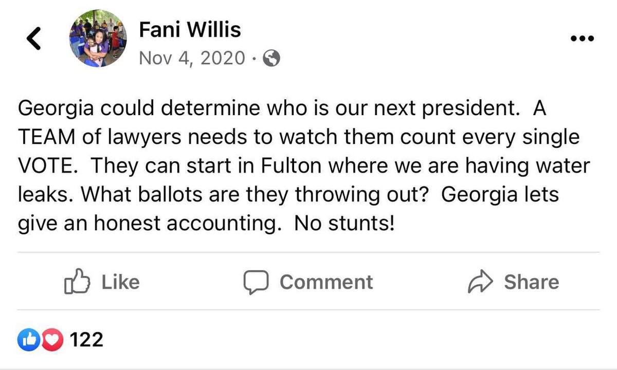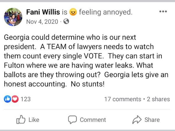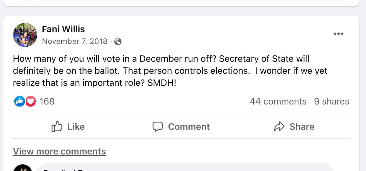 In the days following the 2018 midterms, Fani Willis expressed concerns about the election not being properly run by implying all votes weren’t counted: In a Facebook post she wrote: “You all better start paying attention to what is really going on…” https://t.co/CH2AYaqGB7