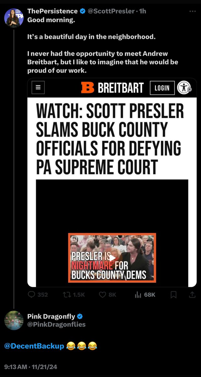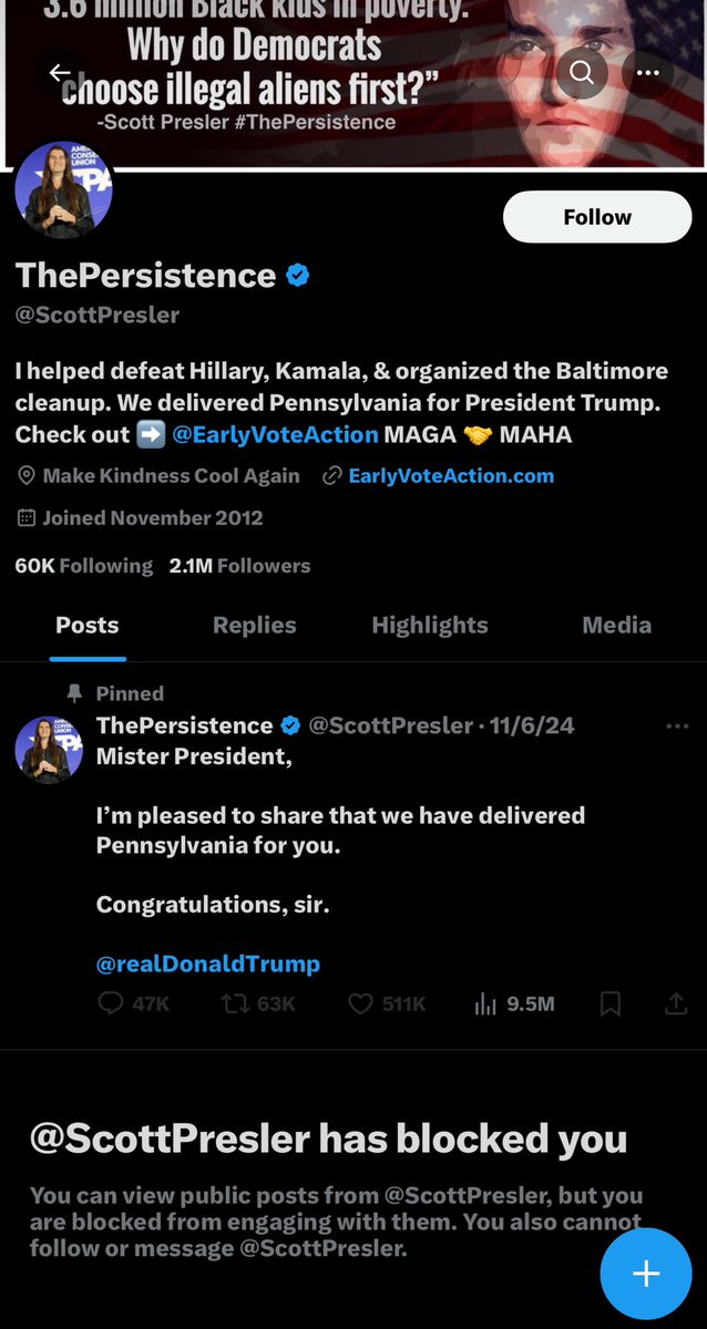 I wish I could engage this post directly to congratulate Scott on all his “hard work in PA”, but he’s already blocked me. What a shame. https://t.co/XfuxE0bBit