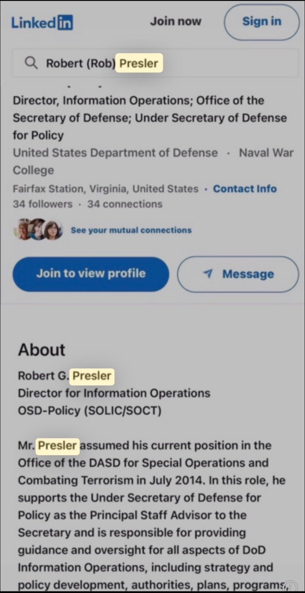@DecentFiJC from beyond the ban Original post from TS @ https://truthsocial.com/@DecentFiJC/112196832835405523… @EmeraldRobinson, you should invite @ScottPresler’s dad, Rob Presler, onto your show and ask him what his relationship is with Tal Hanan… you know, the ISRAELI cyber thief who steals elections around the world (including ARIZONA 2022) and also happens to be the IDF LIASON to the US NAVY. 💥FUN FACT: Rob Presler is the DIRECTOR OF INFORMATIONAL OPERATIONS for the PENTAGON, and a retired NAVY CAPTAIN who served 24-years. Maybe a good follow-up question to ask him would be something like — “Btw, did TPUSA pay your son $5,000,000 last year because of their ties (via Charlie Kirk) to IDF UNIT 8200, combined with YOUR apparent ties to Tal Hanan?”