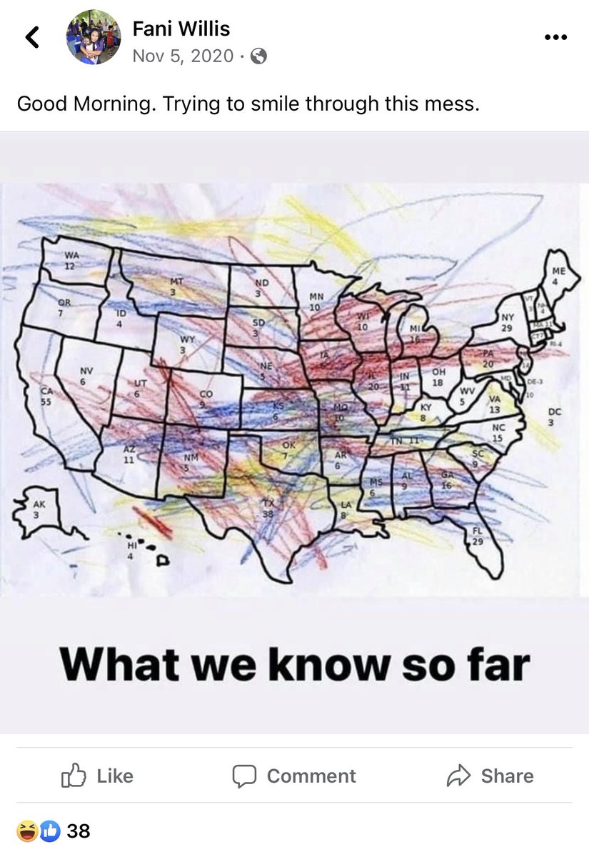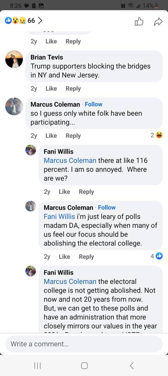 In a subsequent Facebook post, Fani Willis agrees with a racially-motivated commenter that “only white folk” are voting in the election by expressing skepticism in voting data by replying: “There at like 116 percent. I am so annoyed. Where are we?” Willis then goes on to brag about the ability to install “an administration that more closely mirrors our values”