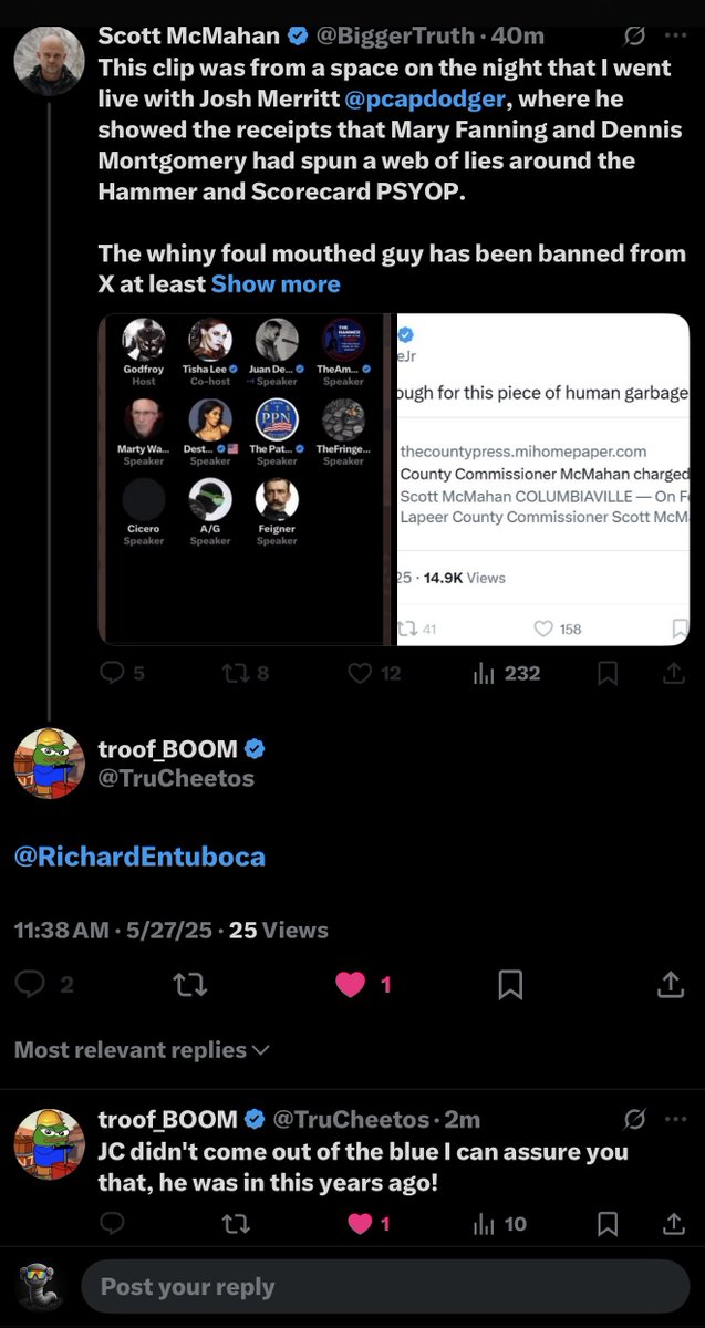 Okie doke. Let’s break this thing down with facts and see if we identify any overt lies from Scott within his comments about AIPAC. 💥PART 1: “AIPAC is one of many lobbying groups…” 👺TRANSLATION: “AIPAC is no different than any other ‘lobbying group’ out there. There’s nothing atypical about them. This is totally normal.” 💥PART 2: “I don’t read much into it.” 👺TRANSLATION: “Neither should you. Nothing to see here.” *Note the overly dismissive language and insinuations used to describe AIPAC by Scott. But what do the FACTS say? Welp. ✅Unfortunately for Scott McMahan, we already KNOW some additional facts about AIPAC, and about Scott, which he didn’t disclose here. And given the nature of his overly dismissive comments with regard to AIPAC, it’s not only apparent that he’s being disingenuous… it’s clear to me he’s outright LYING. But, how do I KNOW he’s lying? ✅TWO key factors: 1. Because of admissions/disclosures straight from the horse’s mouth itself. *Thanks to Mossad/IDF whistleblower, Victor Ostrovsky, and his 2nd book, “The Other Side of Deception”, an exposé of the dealings of Israeli intelligence and its operations, page 236, we know CONCLUSIVELY that AIPAC isn’t just some run-of-the-mill “political lobby” that supports every politician in Congress. Instead, AIPAC is literally one of THREE major arms of MOSSAD operating within the United States — AIPAC, ADL & UJA-FEDERATION. *When we consider Scott’s unwavering, irrational commitment to painting ME as an “antisemite” and “Flynn operative”, DESPITE any facts and context I might provide, it’s clear that his entire style of engagement and his hypersensitive, pre-packaged, default responses are simply not organic, adaptive or discerning in any way. Instead, they’re ALL entirely predicated on a singular commitment to an ultimate, predetermined objective — “PROTECTING JEWS from Nazis (like me)”, regardless of what information and/or evidence to the contrary he may be presented with. In the year 2025, no less. *These aren’t the words or communication styles of reasonable human beings who engage in good-faith discussions or debate. This is the militaristic rhetoric of someone who has been groomed to operate towards the accomplishment of a SINGLE, UNMALLEABLE AGENDA. That agenda supersedes any necessity to consider all pertinent factors and extenuating circumstances of a situation in any specific context. *NOTE: This is NOT normal. It is something that is PROGRAMMED, INDOCTRINATED into Scott’s psyche over time through countless drill and repetition, and sounds almost IDENTICAL to exactly what Ostrovsky describes in his book on that VERY SAME PAGE below: “…the youth camps called ‘HETS VA-KESHET’ (“bow and arrow”) that the MOSSAD organizes to bring young Jewish kids to Israel for the summer…” (This next part is KEY.) “…After filling the kids with a LARGE DOSE of MILITANT ZIONISM, the Mossad sends them back as the SPIES OF THE FUTURE.” *This is exactly the same kind of drone-like, robotic commitment to his “no matter what you say, you’re an antisemite” shtick. Rational, reasonable adults simply do not behave or communicate this way with others. 🚨Scott is/was programmed to serve an agenda. Ok, so is there anything else of importance we should consider as it relates to Scott and what he’s REALLY all about, with his repeated attacks and redundant, baseless accusations against me? Yep. 2. What Scott HASN’T told you, is that he’s also the COMMISSIONER of LAPEER COUNTY in MICHIGAN, a state whose 2020, 2022 and 2024 ELECTIONS have been run by, stolen by and administered by KNOWN MOSSAD ASSETS — GRETCHEN WHITMER, JOCELYN BENSON and DANA NESSEL. *And no person on this site has done MORE to expose DANA NESSEL’S almost CERTAIN involvement in the MURDER of SAMANTHA WOLL, her former 2022 POLITICAL DIRECTOR, who was NOT “on-board” with ISRAELI GENOCIDE of PALESTINIANS and a HOSTILE TAKEOVER of GAZA/WEST BANK, than me. 🚨Scott is protecting one of his own.