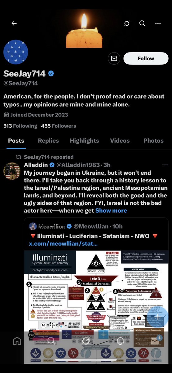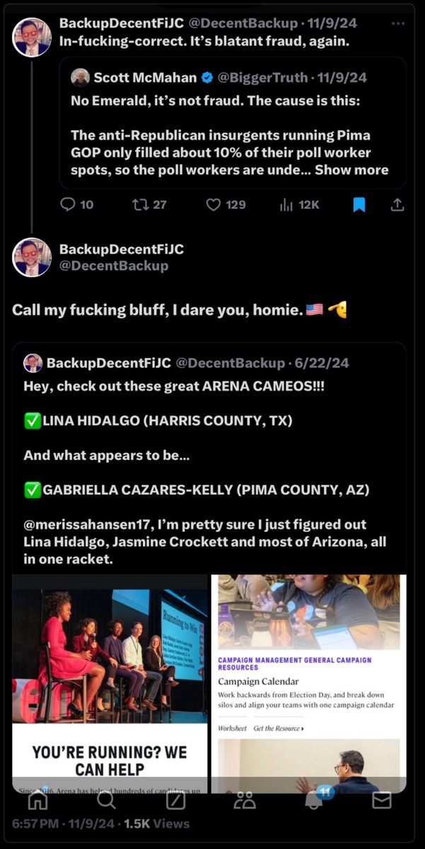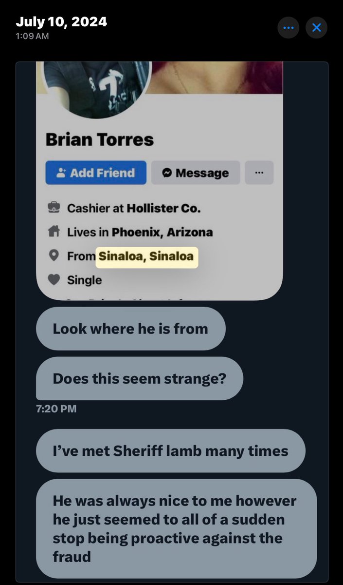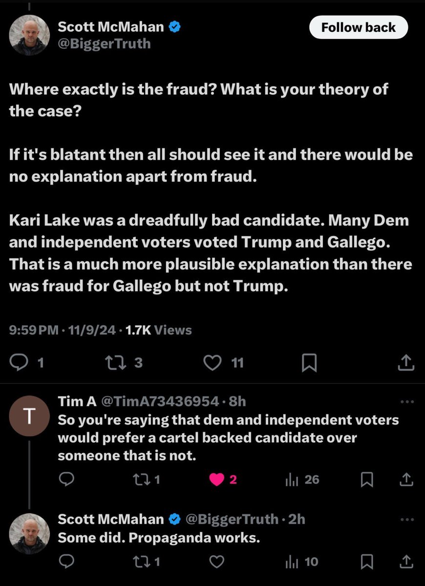 Scott McMahan: “I don’t speak out much against Mossad.” “I don’t believe that Israel is the center of corruption in the world, although I’m sure it’s at least as corrupt as our government.” Also Scott McMahan (when he followed me): SM - “Kari Lake was a dreadfully bad candidate. Many Dem and Independent voters voted Trump and (Jeffrey Epstein associate) Gallego. That is a much more plausible explanation than there was fraud for Gallego but not for Trump.” (🤣🤣🤣🤣🤣) TA - “So you’re saying that Dem and Independent voters would prefer a CARTEL-BACKED CANDIDATE over someone that is not?” SM - “Some did. Propaganda works.” (🤣🤣🤣🤣🤣) Speaking of a “cartel-backed candidate” that “some did prefer” and who ignores election fraud nowadays, we should talk to Pinal County Sheriff Lamb. Maybe ask Sheriff Lamb who Brian Torres is from Sinaloa.