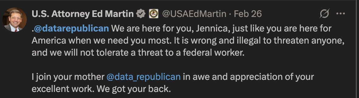 Hello @SenThomTillis , You say you oppose the nomination of Ed Martin for U.S. Attorney due to concerns about his stance on political violence. Let me be clear: I know political violence. I've lived through it. I still am living through it. Two months ago, I was doxxed. News outlets followed with targeted stories; one in particular from the Salt Lake Tribune focused on my husband’s distillery. The comments beneath that article didn't treat it as news. They treated it as a map, a place to boycott and protest. Then came Dogequest, a viral site featuring that same distillery with a Molotov Cocktail cursor. His address was the only one in Utah visible without zooming. Thas was incitement. We received threatening messages. We pulled our kids from school. I fled the state. For six weeks, I homeschooled in hiding. When I returned for a small public event, the hosting group assembled an eleven-person security team just so I could speak. During that chaos, one public official stood up. One. Ed Martin. From his official X account, he publicly condemned the harassment. That one post—at that time—did more to make me feel safe than anything else. And you? You've said nothing. Not a word on the swattings. Nothing about the firebombings. Nothing about the vandalisms. Nothing about the fear your constituents are experiencing daily. Do not lecture me about "concerns" over political violence. I've been targeted by it. Ed Martin opposed it—loudly, publicly, immediately. If you block his confirmation, I will hold you responsible. I will call, publicly and relentlessly, for your primary. If you are truly serious about stopping political violence, then confirm the man who already stood against it when it mattered most. Confirm Ed Martin for U.S. Attorney.