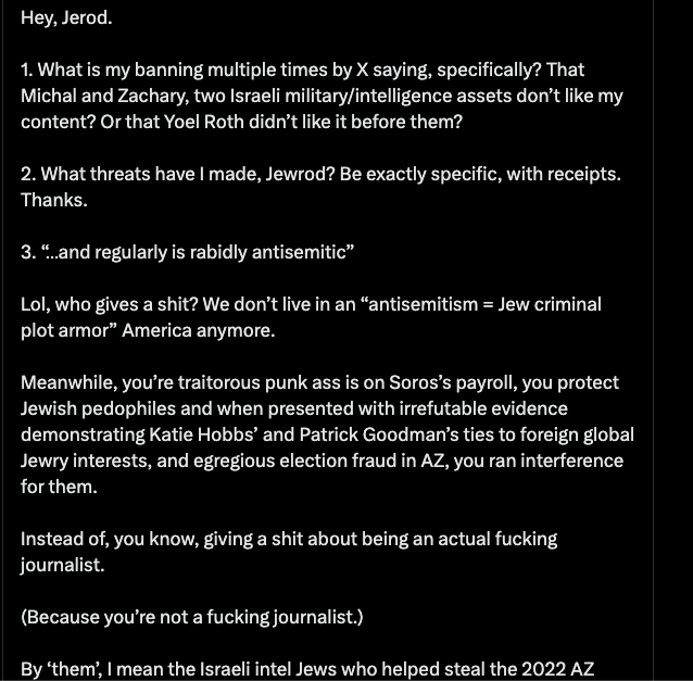 This account has been banned multiple times by X, which is saying something under their current guidelines. He's made threats and regularly is rabidly antisemitic. On his newly created account, one of his followers (who has consistently followed him) is the @MaricopaGOP https://t.co/6WDTb5eawj