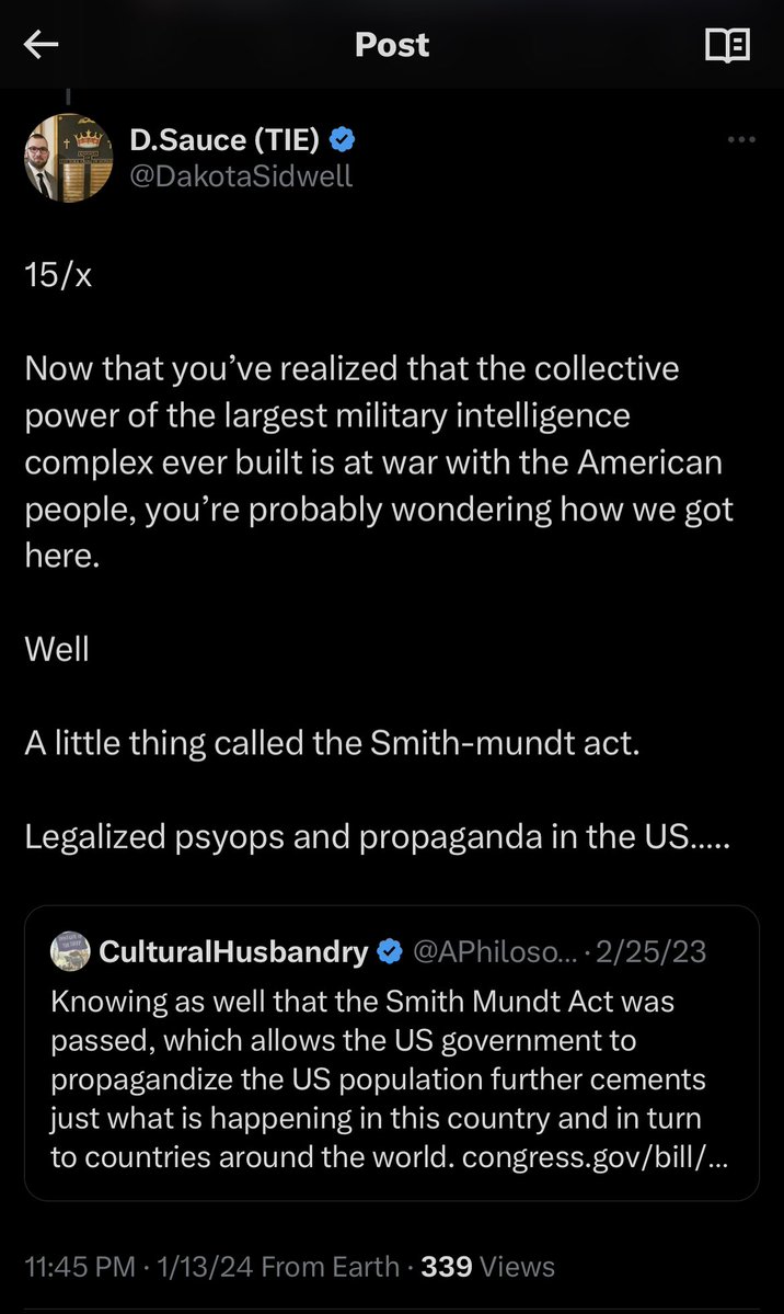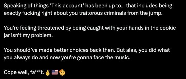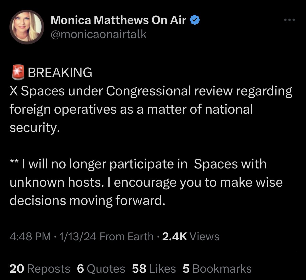 Then, consider this information having come out yesterday without any clear substantiating information, but calls out “foreign operatives” in twitter spaces, which is where I spend the majority of my time on this platform. So the question now must be asked, who’s accusing me of being a foreign agent ?
