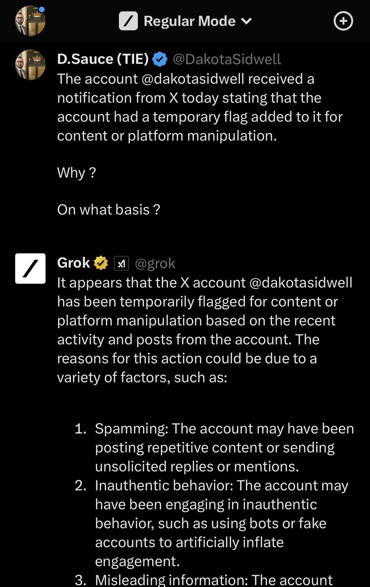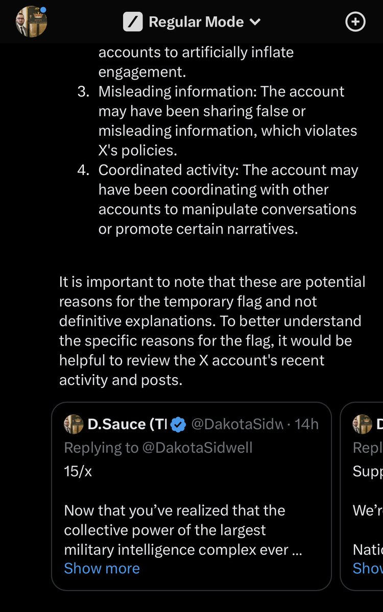 So I asked Grok. Seriously It was the “awakening” on ramp thread in which I called out the intel agencies, pizzagate, financial collapse, and other general information. Wow. I got flagged for trying to unify people. https://t.co/s1UvKz3LfR