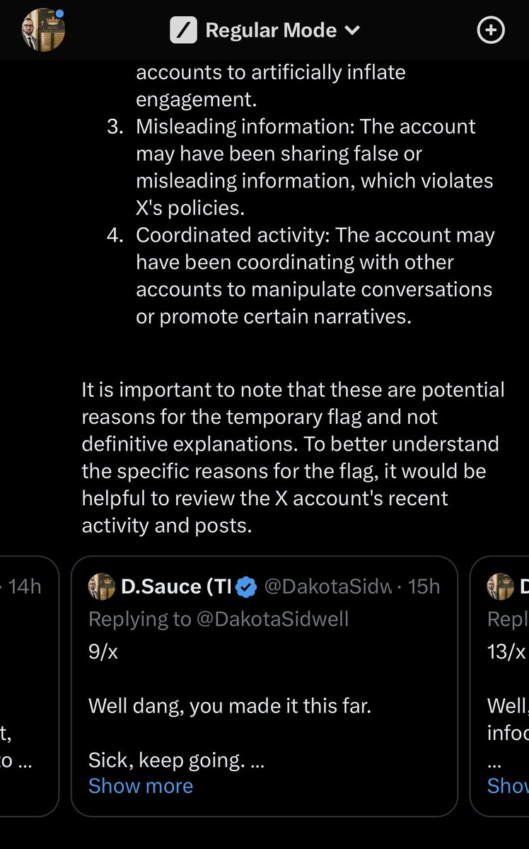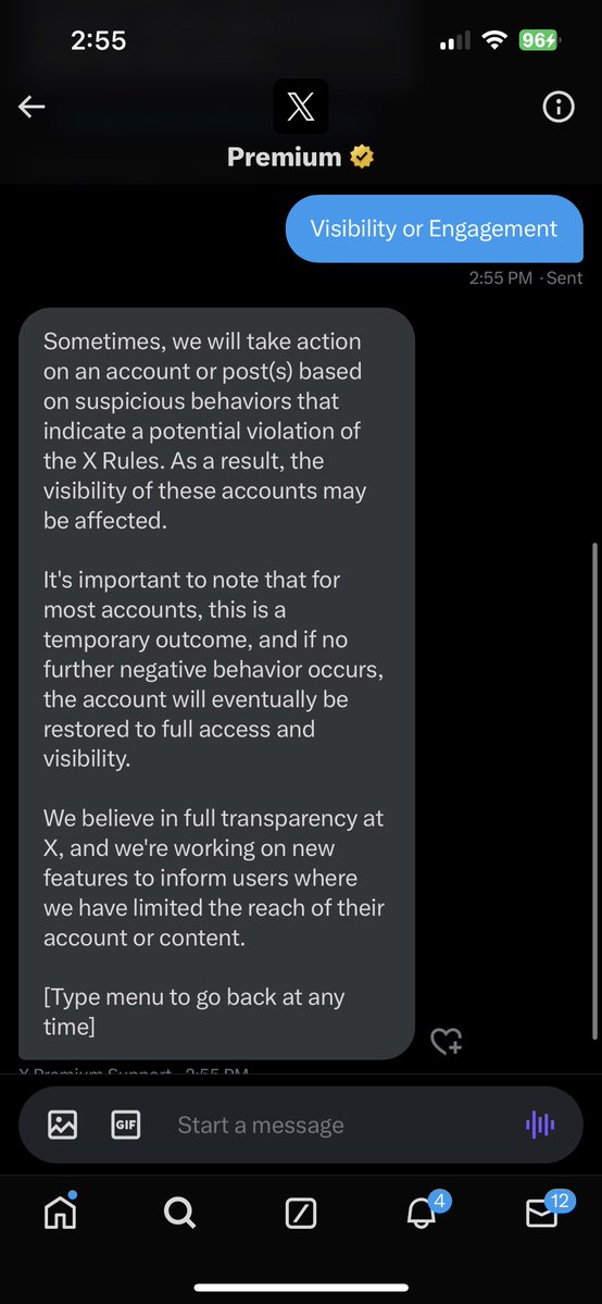 So I messaged the @premium dm line to try to understand this, and the response I received is below. Even if it’s a temporary flag, temporary censorship is still censorship. And I’ve done nothing wrong. So I’d speculate whoever / whatever flagged my account is actually the offending party in manipulating the platform.