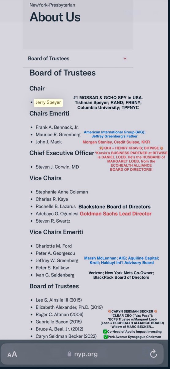 Hey, there’s Ivan Seidenberg, the former Chairman & CEO of Verizon, serving as Vice Chair Emeriti on the Board of Trustees at New York Presbyterian Hospital. Turns out, he works right alongside Jeffrey Greenberg (Marsh McLennan/AIG/Kroll) and Peter Georgescu (Open Future Institute) at NYPH, and directly under Jerry Speyer (Tishman Speyer/Breakthrough/PFNYC/FRBNY/RAND) and Maurice Greenberg (AIG/China/Starr Foundation). Oh, and Verizon is a huge donor to Brookings Institute too, which is run by Carlyle Group Jew and COVID bioterrorist, David Rubenstein, its Chair Emeritus. Imagine the fuck outta that, sports fans.🤦🏻♂️