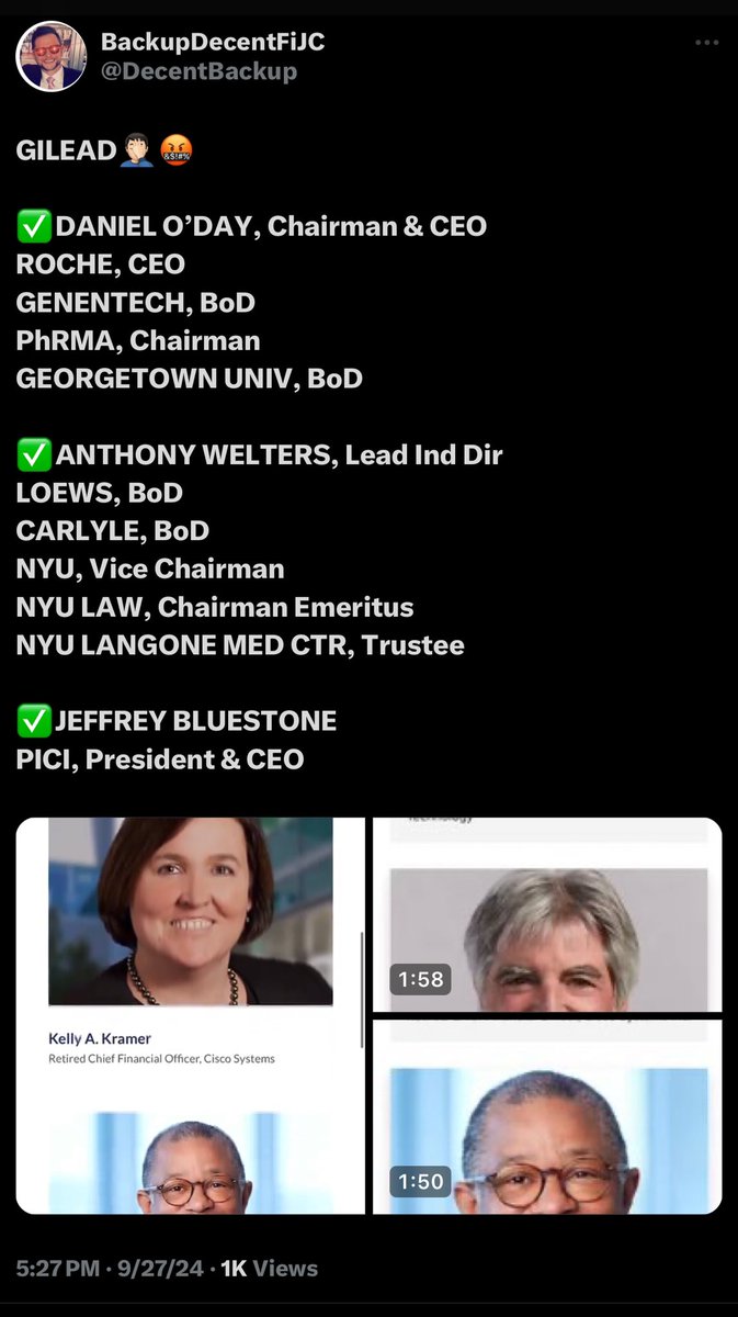 PhRMA - Gilead (Remdesivir, Pfizer), Genentech (Kleiner Perkins, 23andMe, Seagen), Pfizer (Seagen, Ginkgo Bioworks, Tempus AI, Carlyle, LUX Capital, DXC Technology), Loews (Tisch/UJA/Mossad, Mount Sinai, Weill Cornell, NYPH), Carlyle (Rubenstein, Duke, Wuhan, Booz, 9/11, kid trafficking), NYU (UJA), PICI (Sean Parker, Facebook, Valerie Jarrett, Obama Foundation) and… CNBC CEO Councils - Bill Barr, Mitt Romney, Gretchen Whitmer, Paul Ryan, Palo Alto Networks (Qualcomm/IDF Unit 8200/Mossad)