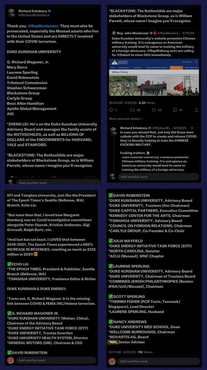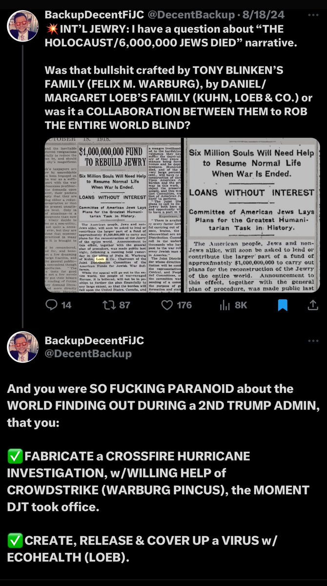 Now that my 12-hour timeout is over, we’ll address some key housekeeping (gatekeeping) items… 1. My name is Jonathan. It’s not Johnny or Richard or Ricardo or ‘whatever it is’. And you already knew that. Madz. 2. They targeted me first as part of a much larger and internationally-organized informational influence and gatekeeping operation. Choosing to fuck with me was THEIR royal fuck up. Not mine. Many have done so in the past and found out just like they will. 3. What list is that? Is it the one where I’m the only dude who actually lives in America and who’s White, Christian AND male, and you’re the fgts living in France, Guatemala and Australia? Cool. I added you. 4. Unfortunately for you (and them), I don’t lie. I just work harder and happen to be a gazillion times smarter than all of you combined. But most of all, I’m not a subversive fucking anti-American sellout on foreign soil pretending I’m qualified to arbitrate who and what are acceptable for America… and I keep better receipts than you can possibly fucking imagine. I’m the dude the Flynn network traitors collab’ing with Unit 8200, NATO, Cerberus and BigTech fears more than anyone else here. If you hadn’t learned that by now, that’s your own fault. So you’re about to learn a hard lesson. 5. You didn’t hear that. Okie doke. Now that all THAT’S outta the way, let’s discuss why Alladin considers General Flynn (Unit 8200; NSO/OSY/Q Cyber) a legend and Ivan Raiklin (Bolshevik/Israel/J6/Flynn) a buddy. And why he’s ‘fiercely protective of his sister @DataRepublican, and @TPASarah (CIA; VP of Ukranian Operations) and @StealthMedical1 (IDF)’. And why he chose the week after my account received a worldwide blackout to begin running his ‘Israel is not the bad actor’ campaign with meowllion’s ‘intel’, while simultaneously going after Candace Owens and simping for Seth ‘Chabad Lubavitch/Libs of Tik Tok LLC/Premier Speakers Bureau (WEF)/Tempus AI/COVID bioterrorists’ Dillon… simply because Candace is (correctly) shining a light on the jew/Israeli murder of Charlie Kirk at UVU. *Alladin - Citing Meowllion’s work* “Israel was NEVER the bad actor.” - Mondomedia “When I get there I will show you why exactly Israel is not the bad actor here.” - Alladin “Looking forward to the the joos psyop being debunked.” - PatriotPup “Stay tuned.” - Alladin And why Infowars fgts are so hellbent on gatekeeping information about George H. Zinn AND Zachariah Qureshi, while also pretending CIA alums like John Kiriakou ‘have no idea what Palantir does’. *HINT: It’s because it takes down ‘the joos’ AND the LDS Mafia, who’ve treasonously collaborated with the CCP (Tsinghua University; Echo Liu; Epoch Times; Duke Kunshan University) and Li Ka Shing/Richard Li (Bridgetown III Holdings; Matt Danzeisen/Peter Thiel/Daniel Wong/BlackRock/Salesforce/CrowdStrike/Team8/Unit 8200/Eric Schmidt/UC-Berkeley/Jennifer Doudna/COVID/Tempus AI) behind the backs of the United States of America for MORE THAN TWO DECADES, if not far longer. Or why they thought funneling their disinfo to DataRepublican thru fgts like Alladin, Lisa Logan, SKDoubleDub33, SeeJay714, etc. would work. Especially since I’d ALREADY exposed the DataRepublican grift (and her handlers, Laura Loomer and Sloan Rachmuth), and my previous alt got nuked for JUST EXPOSING their direct ties to JEW TERRORIST ORGANIZATIONS like BETAR (KAHANE CHAI) and operatives like RONN TOROSSIAN and SLOAN RACHMUTH. Or why they thought I wouldn’t fucking figure out that in the first George H. Zinn space I was in and couldn’t get a mic, which was co-hosted by @RyanMattaMedia and @BasedSamParker, that Matt Baker (Infowars) was one of the few speakers who DID get a mic. And that another of the speakers was some South African dipshit nobody had ever heard of… …or that @IanMalcolm8, who was ALSO on that speaker’s panel, had temporarily UNFOLLOWED me so I couldn’t DM him to tell the hosts to give me a mic either. Weird. Since GEORGE ZINN was OUR SHIT.