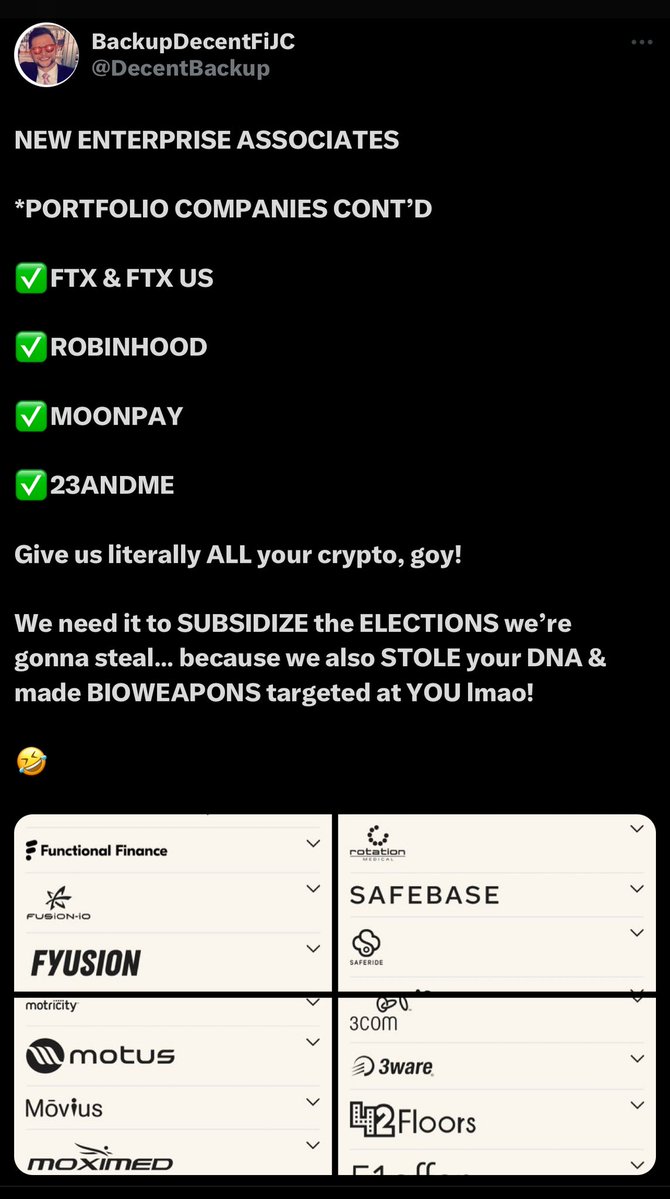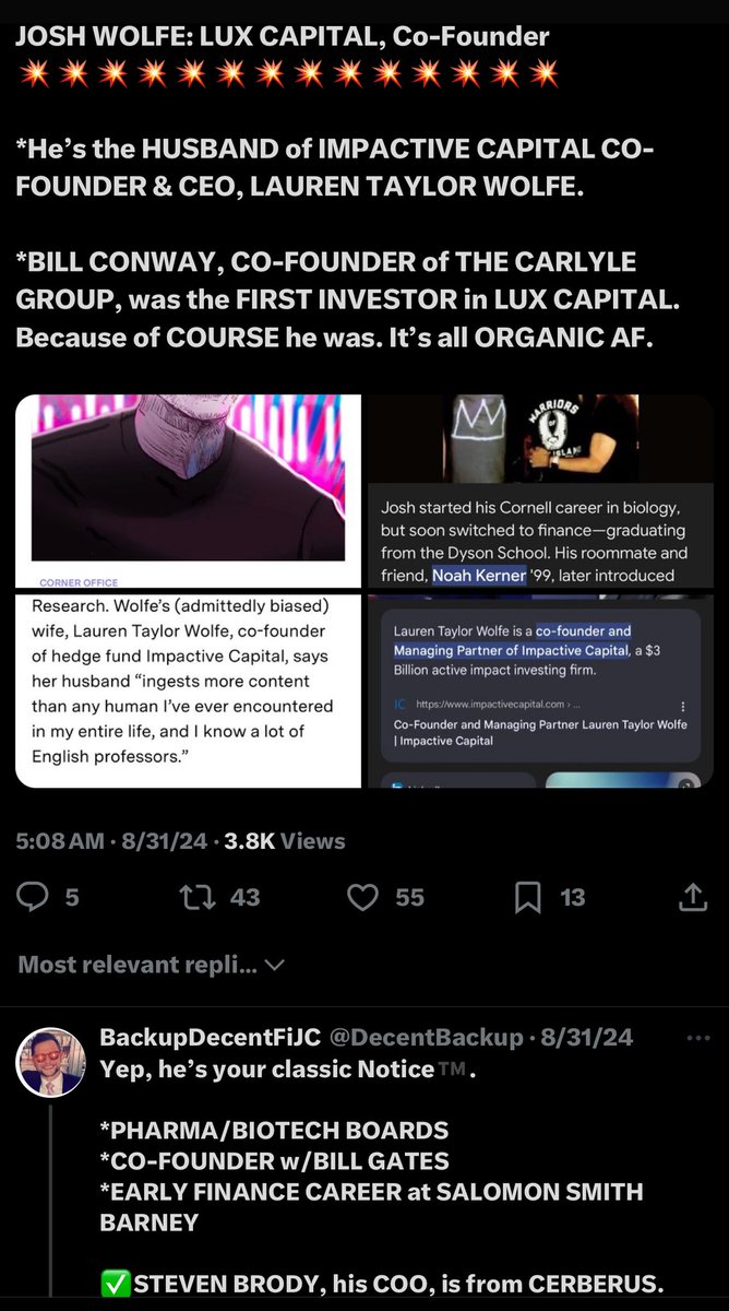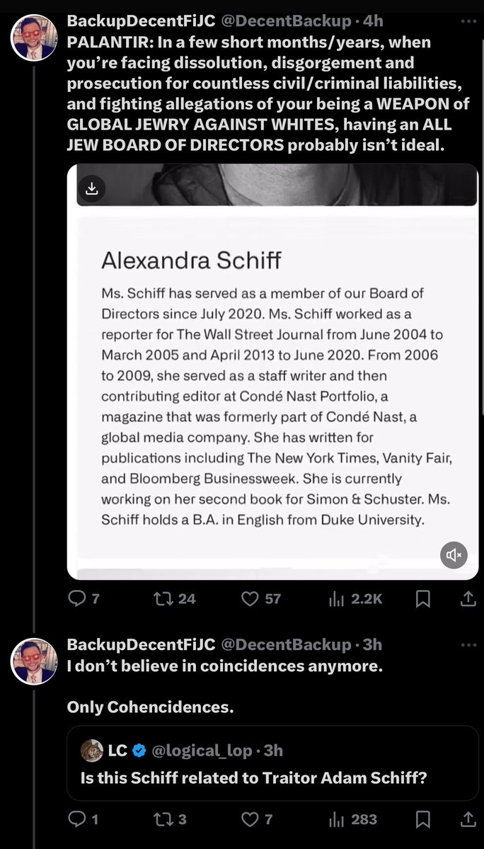PALANTIR: Check out your investors. 💥💥💥💥💥💥💥💥💥💥💥💥💥 ✅ARCH Venture Partners - IQT/Nuclear Threat Initiative (NTI)/CFR ✅NEW ENTERPRISE ASSOCIATES - IQT/Brookings/Peter Barris/Scott Gottlieb ✅8VC - BlueVoyant (K2)/Glocer/Merck/Ericsson/Goldman Sachs/Cleveland Clinic ✅LUX Capital - Cerberus/Carlyle Group/Josh Wolfe (Lauren Wolfe)/Woolsey/Pfizer/SIAR/UJA & UBS (Mossad)/Envestnet *This was from memory, fa***ts. Imagine what I’d be capable of with an all-White, Christian-controlled Palantir at my fingertips.