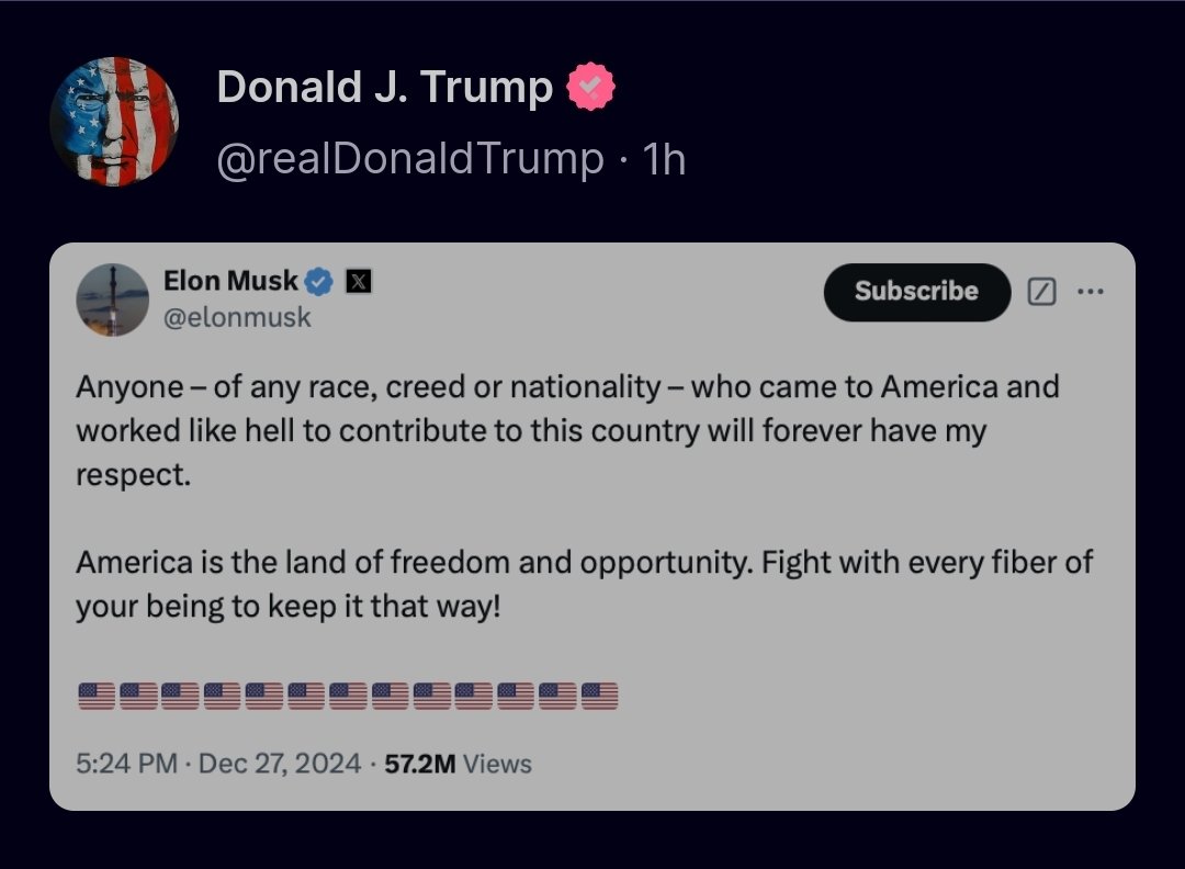 Elon Musk is fired up about America's future! 🔥🇺🇸 "This is what victory feels like!" "This was no ordinary victory. This was a fork in the road of human civilization." "This one really mattered. Thank you for making it happen! My heart goes out to you. It is thanks to you that the future of civilization is assured." "We're going to finally have safe cities. Secure borders. Sensible spending. Basic stuff. And we're going to take DOGE to Mars!" "Can you imagine how awesome it will be to have American astronauts plant the flag on another planet for the first time?!" "There need to be things that inspire you. There need to be things that make you glad to wake up in the morning and say I'm looking forward to the future." "And let me tell you, I'm going to work my ass off for you guys. I really will. I'm super fired up for the future. It's going to be very exciting. As the President said, we're going to have a Golden Age."