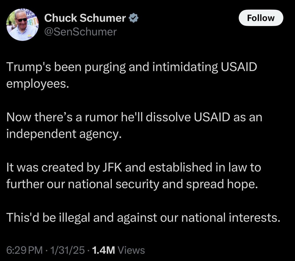 “If Trump/Elon want this to stick they need to completely shut down USAID or fire the entire staff, the party has instructed their allies to not make waves and blend in. USAID is 99% Democrats they will not be able to save it without risking internal sabotage.”