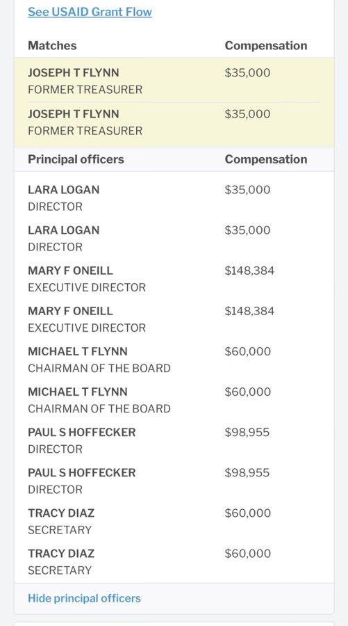 Oh boy. Just LOOK at all these names getting USAID money through their Internews Agency. Joseph T Flynn Lara Logan Mary F O’Neill Michael T Flynn Paul S Hoffecker Tracy Diaz (Beanz) Weird.