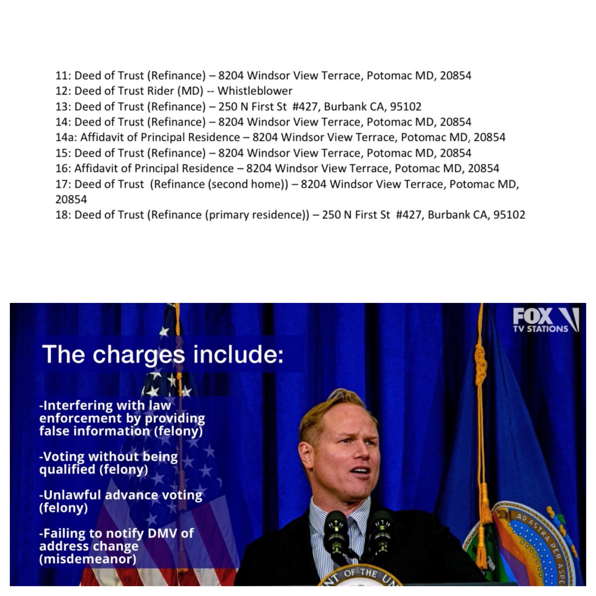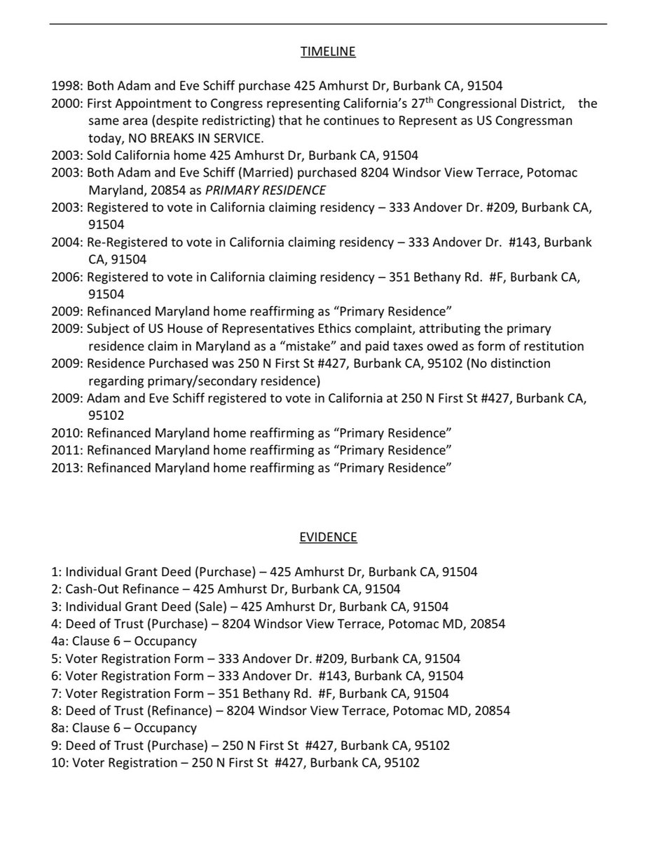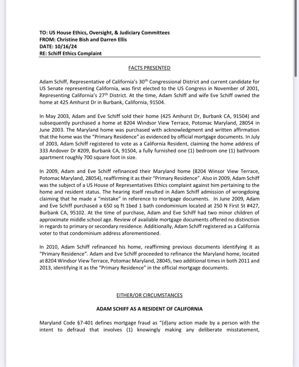 And here it is, Bank Records, voter registration records and a WHISTLEBLOWER CONFIRMS BEYOND THE SHADOW OF A DOUBT, Adam Schiff is guilty of perjury, voter fraud and mortgage fraud violating both state and federal law. “This complaint has been submitted to multiple U.S. House agencies and to the House Judiciary, House Ethics and House Oversight Committee. And it’s true Adam Schiff has been checking the box principal residence on multiple mortgage applications in two different states.” The good news is that the statute of limitations begins at the date of discovery. A complaint was officially filed earlier this year by Christine Bish and Darren Ellis. In other words, the Trump DOJ can arrest, charge, indict, prosecute and incarcerate the fraud @SenAdamSchiff for the crimes of perjury, voter fraud and bank fraud. A Republican member of Congress was charged with criminal counts for doing the same fucking thing, Steven Watkins, of Oklahoma. Federal Bureau of Prisons (FBOP) @OfficialFBOP @ChanelRion @PamBondi FULlL COMPLAINT: https://thedrilldown.com/wp-content/uploads/2024/10/OCT.-2024-Bish-Schiff-Complaint.pdf