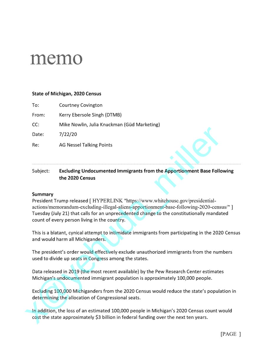 The quiet part out loud!! Read this shocking internal Memo from the Michigan Attorney General's office in 2020 about non citizens being counted in the Census!!! https://t.co/RkBmhaHC9q