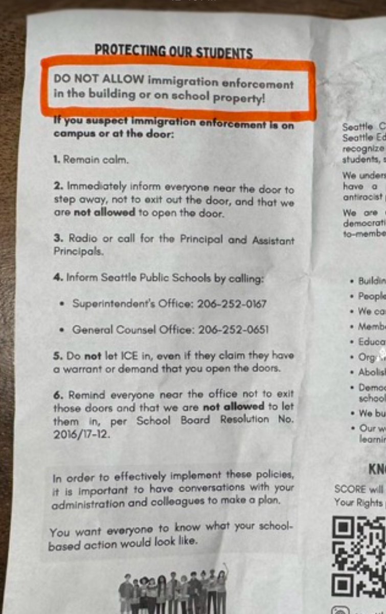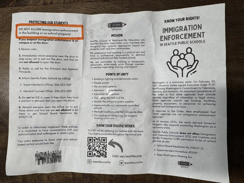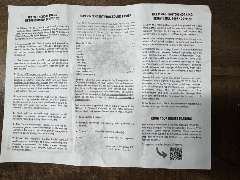 NEW: An astute neighbor found this flyer from Seattle Public Schools in the Queen Anne neighborhood. It’s an entire manual and playbook for helping illegals evade ICE. Now you know where @SeaPubSchools stands on this issue. @EROSeattle https://t.co/mTQNJ8Ndem