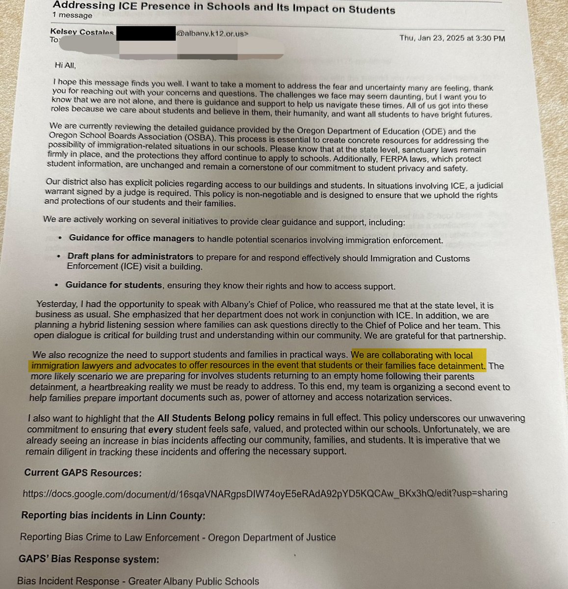 DEI Director of @GreaterAlbanySD in Oregon sent a letter offering resources and legal assistance to help illegals avoid detainment by ICE. This public school district is using tax dollars to shield criminal illegal aliens from law enforcement. Obstructing law enforcement in any way is a crime.