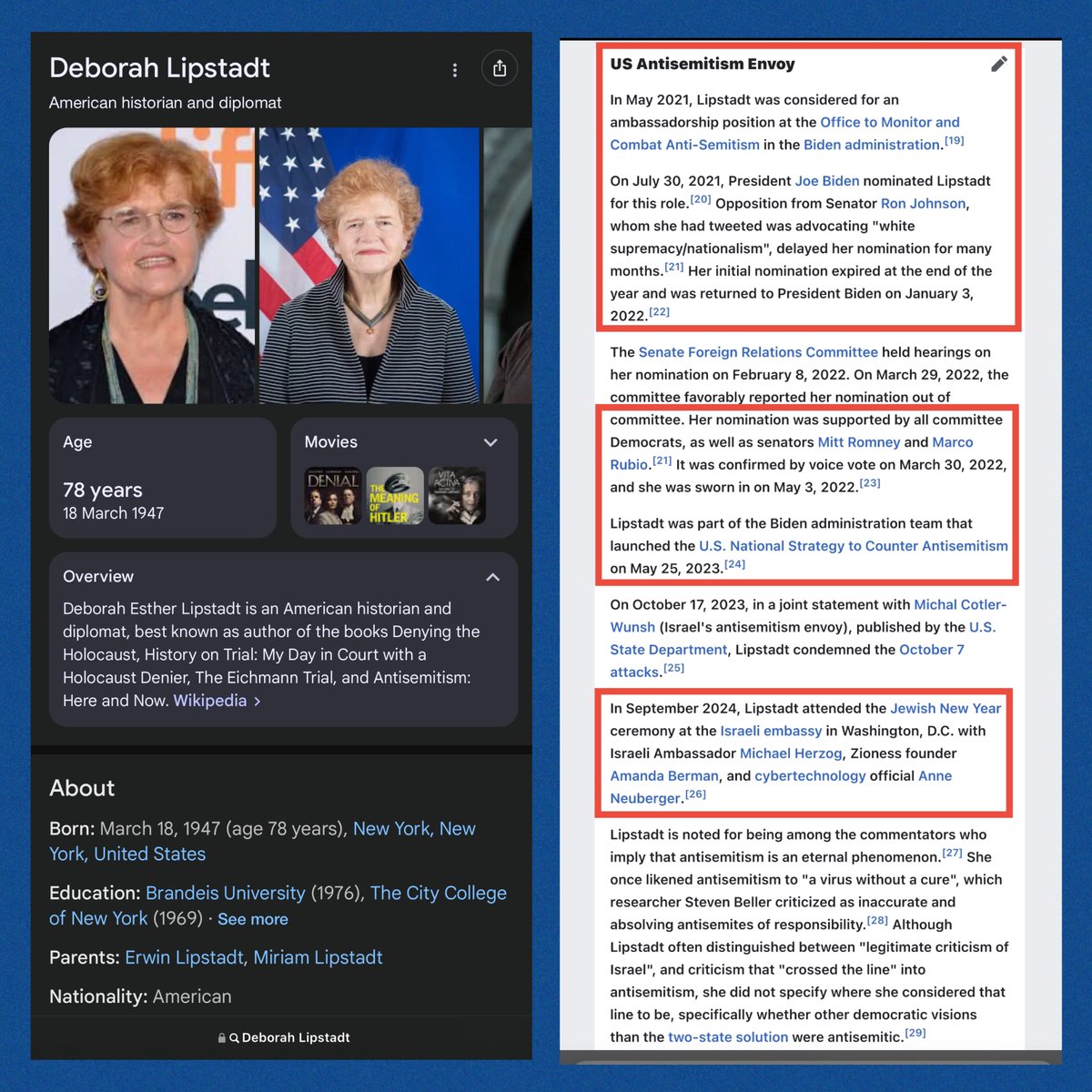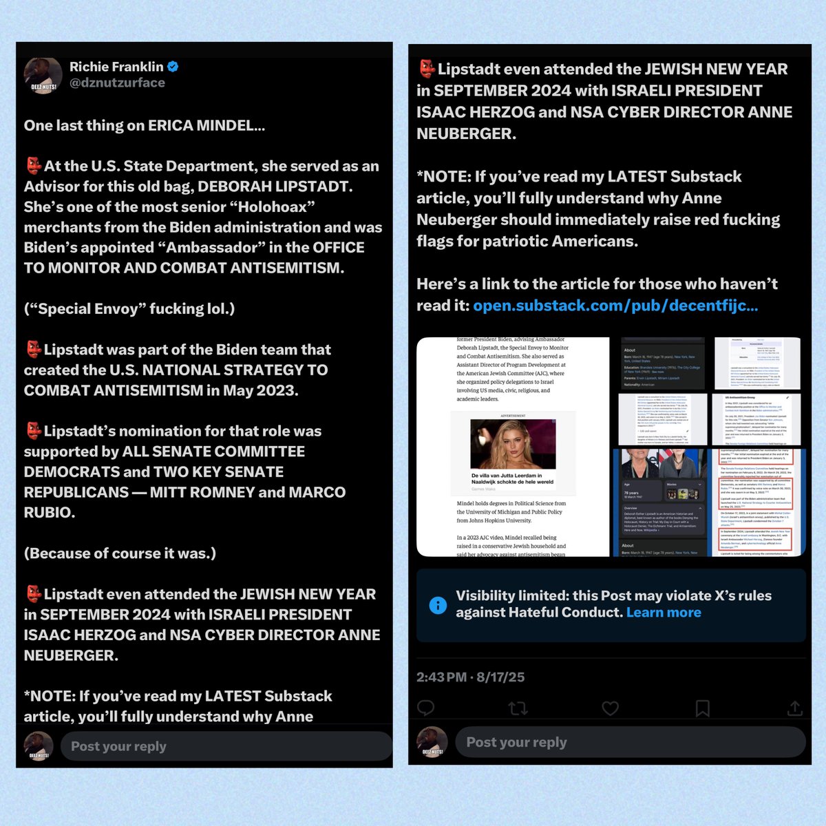 NOTE: They just threw a “Hateful Conduct” label on the original post in sequence after this one, so here it is again w/screenshots. *At the U.S. State Department, Erica Mindel was an Advisor to arguably the SENIOR Holocaust/antisemitism merchant of the Biden administration, Deborah Lipstadt.