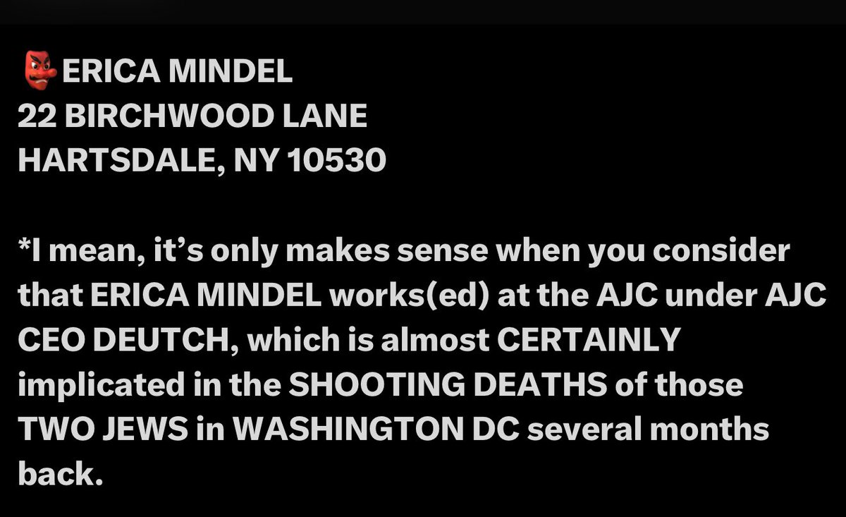 *ERICA MINDEL* TIKTOK, IDF, ZIONIST, AJC, U.S. STATE DEPT She’s developed the new, one-sided “hate speech guidelines” for TikTok (ByteDance) that basically protect Jew supremacy and collectivization, while outlawing any kind of White collectivization whatsoever. Gosh, this really seems like the IDF just made another move of aggression against White non-Jew Americans. It’s another (illegal) move to further abridge the 1A-protected rights to free speech of White (Christian) non-Jew Americans, and craft an additional avenue for Jews to use as pretext to unconstitutionally ruin the potential careers and earnings opportunities of the group they openly hate and illegally discriminate against (without recourse) without due process — American White Christians. Meanwhile, the IDF is protecting those same Jews from the possibility of American Whites justifiably doing the same to them in retaliation. I tell ya, folks. This fucking bullshit just ain’t gonna work for me anymore, gang. In fact, I think we should go right to the source and discuss this with this traitorous cunt and foreign enemy combatant in person. 👺ERICA MINDEL 22 BIRCHWOOD LANE HARTSDALE, NY 10530 *I mean, it’s only makes sense when you consider that ERICA MINDEL works(ed) at the AJC under AJC CEO DEUTCH, which is almost CERTAINLY implicated in the SHOOTING DEATHS of those TWO JEWS in WASHINGTON DC several months back. *And ESPECIALLY since her parents are fucking SPIES, her sister, LAUREN MINDEL, most recently worked at a CHILDREN’S CAMP In WISCONSIN (Camp Ramah), her mother, SHEILA YOSSEM, is DIRECTOR OF ADMISSIONS for the SCHOOL OF SOCIAL WORK at YESHIVA UNIVERSITY, and her FATHER, ROBERT MINDEL, is literally a PARTNER at MERCER… …aka, MARSH MCLENNAN. (Mom is basically a career/workforce gatekeeper working directly against White American non-Jews, on behalf of American AND ISRAELI JEWS who live in the United States of America. Treason. I guess it’s a good thing that cunt speaks fluent HEBREW.) *ROBERT MINDEL (father) *SHEILA YOSSEM (mother) *LAUREN MINDEL (sister) (They even have a place in Montreal, so she’s probably helping Canadian Jews too.) *Oh, and before I forget: 👺That’s the same MARSH MCLENNAN that was involved in the ghoulish WESTERN NORTH CAROLINA FEMA BULLSHIT, which involved DUKE ENERGY FLOODING BUNCOMBE COUNTY during HURRICANE HELENE (Lloyd Yates, Duke Energy President of North Carolina Ops, EVP of Duke Energy), and was also involved in the LA FIRES ARSON TERRORISM and the COORDINATED CANCELLATION OF SOUTHERN CALI HOMEOWNERS POLICIES just months prior to the arson/fires (John Q. Doyle, St. John’s University Maurice R. Greenberg School of Risk Management). 👺That’s the same Marsh McLennan whose former Chairman & CEO, Jeffrey Greenberg (Maurice Greenberg’s son), acquired KROLL INC. (9/11 attacks) in 2005 for $1.9 BILLION (cash) and then named JULES KROLL (9/11 key planner, RFK assassination, K2 Integrity, UJA, Jewish Claims Conference [Holocaust restitution payments against Germany], FTX, Bernie Madoff, Palantir, BlueVoyant, etc.) its DEPUTY CHAIRMAN. 👺Robert Mindel even has a neat little gap in employment, from AUGUST 2001, when he ended his tenure as VP OF CUSTOMER ENGAGEMENT at http://DIETSMART.COM, until JANUARY 2002, when he RESUMED HIS EMPLOYMENT as a PARTNER WITH MERCER (now MARSH MCLENNAN). *NOTE: This was ROBERT MINDEL’S 2ND TIME working for MERCER, having served as a SENIOR ASSOCIATE for MERCER HUMAN RESOURCES CONSULTING, from JANUARY 1989 to JANUARY 1995.