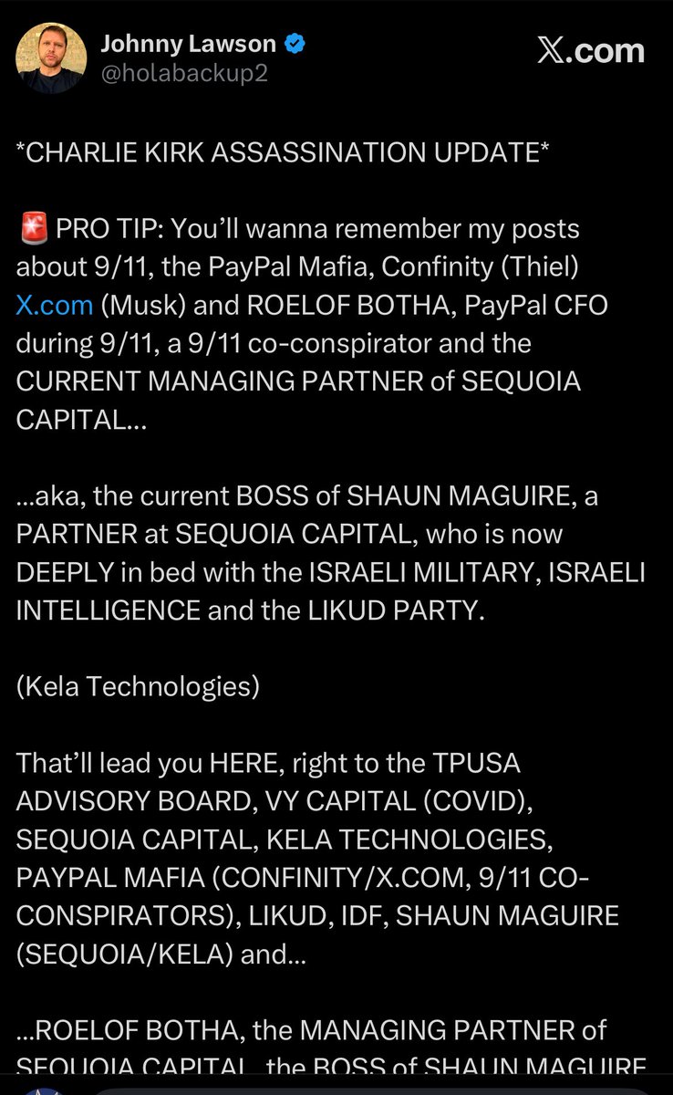 PS: I’m prob the ONLY GUY ON EARTH NOT IMPLICATED IN CHARLIE KIRK’S MURDER who unwinds this shit.✌️ *Don’t worry, once my phone restarts, I WILL post PAUL CAPPUCCIO receipts. AND *Show JD VANCE & COLIN GREENSPON going from MITHRIL TO STEVE CASE/REVOLUTION TO NARYA together.