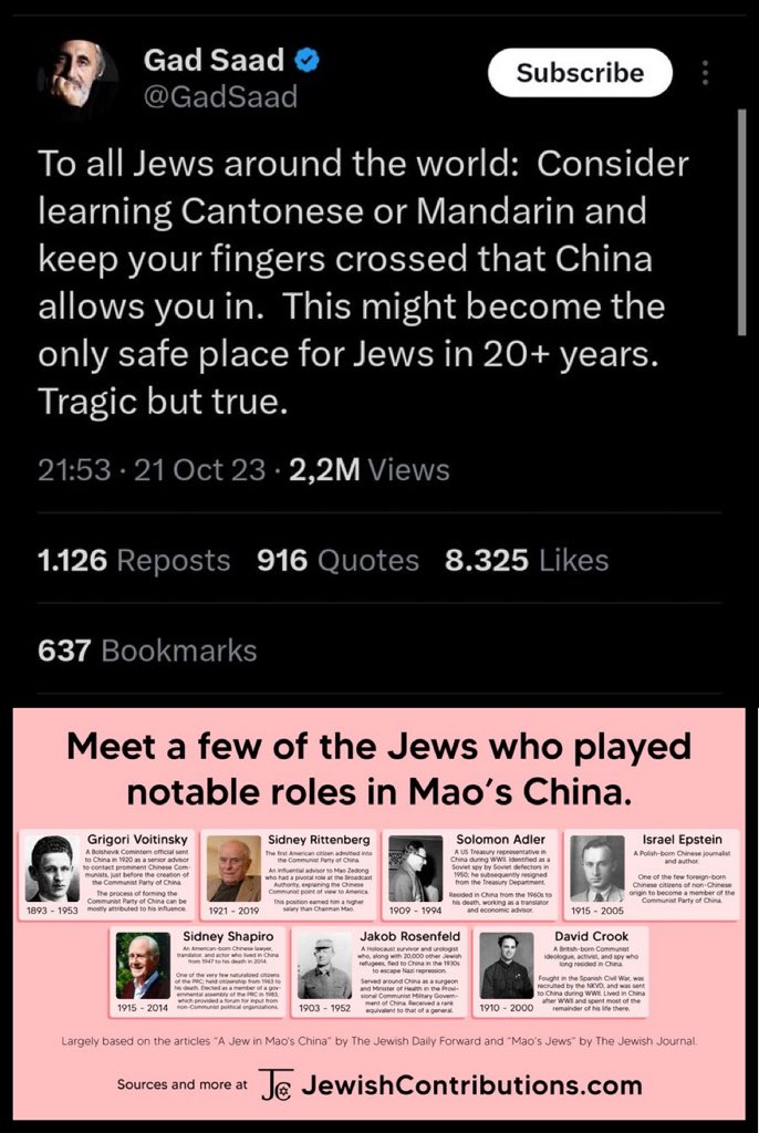 @Byoussef @X @Support @elonmusk 🚨✡️GAD SAAD, THE ALMIGHTY MOSSAD AGENT, is now advising all Jews to learn Mandarin and Cantonese. ✡️What does Gad know? What is he hiding? And why is telling Jews to prepare to run and hide in China? https://t.co/9z9PRZLFGO