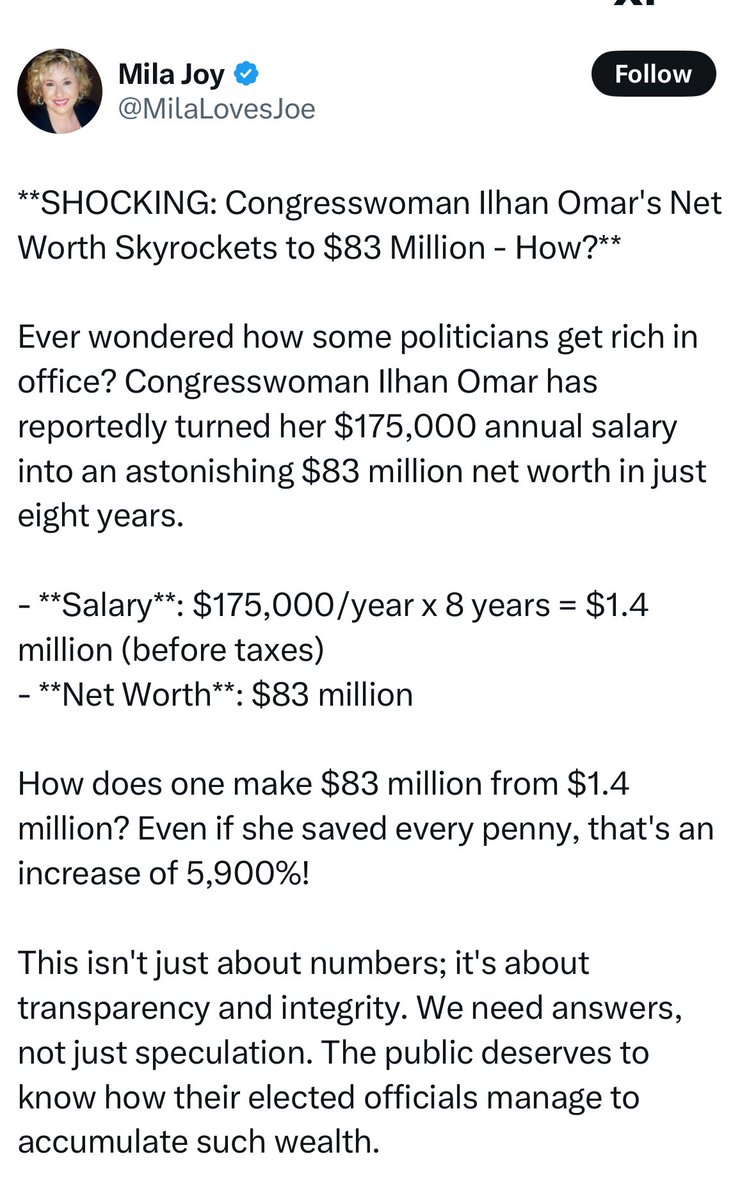 👋🏽 dummy, first of all I haven’t been in Congress for 8yrs and my net worth isn’t $83 million dollars. I know your brain has rotten from the conspiracy theories you are consuming daily but try not to announce your stupidity to the world. My salary is $174,000 before taxes, I don’t have stock or own a home and still paying off my student debt. So if you are going to lie on something that is public, maybe try checking my public financial statements and you will see I barely have thousands let alone millions 🤦🏽♀️. Oh and before I forget, not everyone is as corrupt as the man you worship.