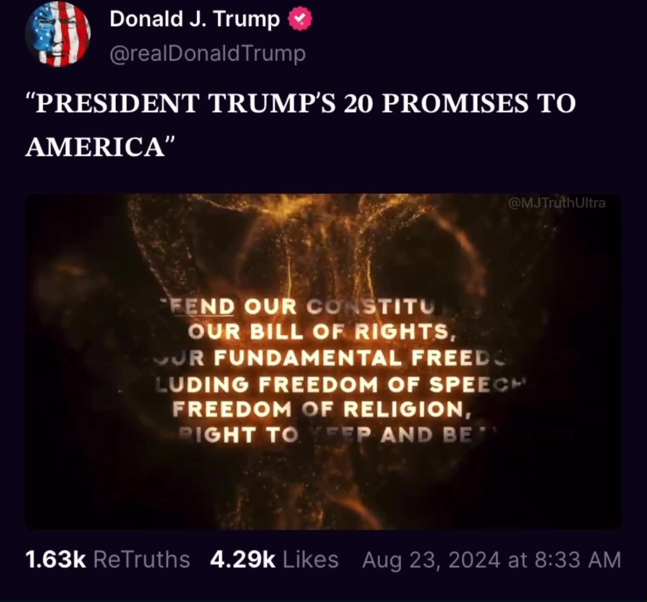 DONALD TRUMP RELEASES HIS 20 PROMISES TO AMERICA 🇺🇸 • Seal the border and stop the migrant invasion • Carry out the largest deportation operation in American History • End inflation and make America affordable again • Make America the dominant energy producer in the world by far • Stop outsourcing and turn the United States into a Manufacturing Superpower • Large tax cuts for workers and no tax on tips! • Defend our constitution, our Bill of Rights and Fundamental freedoms, including freedom of speech, freedom of religion, and the right to keep and bear arms • Prevent WW3, restore peace in Europe and in the Middle East, and Build an IRON DOME Missile defense shield over our entire country — All Made in America • Emd the weaponization of government against the American people • Stop the migrant crime epidemic, crush gang violence, demolish the foreign drug cartels, and lock up violent offenders. • Rebuild our cities, including Washington DC, making them safe, clean, and beautiful again • Strengthen and modernize our military, making it without question, the strongest and most powerful in the world. • Keep the US dollar as the worlds reserve currency • Fight for and protect social security and Medicare with no cuts, including no changes to retirement age. • Cancel the electric vehicle mandate and cut costly and burdensome regulations • Cut federal funding for any school pushing critical race theory, racial gender ideology, and inappropriate racial, sexual, or political content on our children. • Keep men out of women sports • Deport pro-Hamas radicals and make our college campuses safe and patriotic again. • Secure our elections, including same day voting, voter identification, paper ballots, and proof of citizenship. • Unite our country by bringing it to new and record levels of success. MAKE AMERICA GREAT AGAIN! https://rumble.com/v5c2uul-donald-trump-releases-his-20-promises-to-america-.html