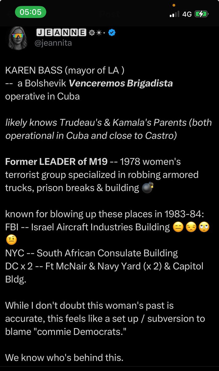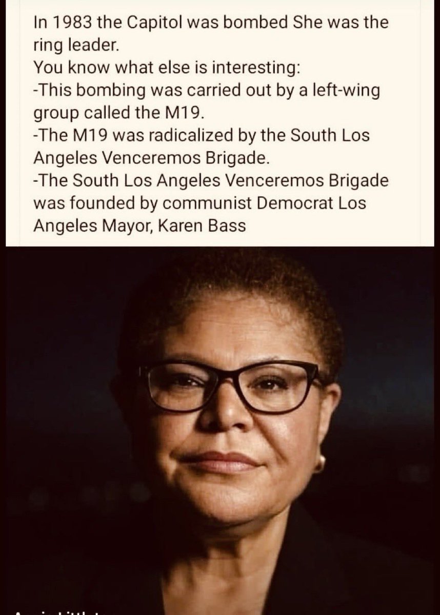 LA Mayor Karen Bass was involved in the 1983 BOMBING of the CAPITOL BUILDING?! That is verrrrry interesting. @LauraLoomer, wanna hear something else interesting? Check this out. *LA Mayor Karen Bass also serves as the Vice Chairman of the National Endowment for Democracy (NED), where K2 Integrity (Kroll) Global Co-Managing Partner, Juan Zarate, is a Director. *Her Co-Vice Chairman at the NED is Peter J. Roskam. He’s a Partner at Sidley Austin (Apollo Global Management), the Co-Chair of the Bi-Partisan Task Force to Combat Antisemitism and was a Director for the Benghazi Investigation in the House of Representatives… where Seal Team 6 was murdered and it was covered up to protect Hillary Clinton (and Israel). *The CHAIRMAN of NED is Kenneth Wollack, the “former” Legislative Director of AIPAC (Mossad). *Eliott Abrams, from the Holocaust Memorial Museum Advisory Board, is also a Director at NED… as is Ben Sasse from the IQT Board of Trustees. *NED was directly involved in the recent LA Wildfires arson (terrorism) with insurance companies like State Farm and “green energy homes” companies like Kaiser Permanente… and aerial firefighting companies like Coulson Group (The Wellness Company), who had the firefighting contracts with Los Angeles County. *LA Mayor and NED Vice Chairman Karen Bass was caught on a recorded phone call discussing the planning of the attack before the fires. Now tell us more about the Saudis.🖕