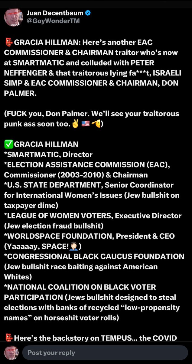 Hey, @LauraLoomer! Remember how you referenced U.S. STATE DEPARTMENT figures for your “Qatar has the most money in American elections, NOT ISRAEL” argument (bullshit) in last night’s space being run by that Jew named “Conservative” in BELGIUM? You know, the one where they wouldn’t give any White, non-Jew AMERICANS a microphone. Does that have anything to do with this? By “this”, I mean SMARTMATIC being the Israeli API tool to hack America’s elections for Israel and Global Jewry ever since 9/11. *SMARTMATIC: Where GRACIA HILLMAN, EXECUTIVE DIRECTOR of the LEAGUE OF WOMEN VOTERS and the SENIOR COORDINATOR FOR WOMEN’S ISSUES at the U.S. STATE DEPARTMENT is a DIRECTOR. (HILLMAN is a former COMMISSIONER & CHAIRMAN of the EAC, which was created by HAVA.) *SMARTMATIC: Where PAUL DEGREGORIO, the “former” EVP of INTERNATIONAL FOUNDATION OF ELECTORAL SYSTEMS (IFES), CHIEF OF ELECTIONS for EVERYONE COUNTS, INC. and a CO-AUTHOR of HAVA is also a DIRECTOR. (DEGREGORIO is also a former COMMISSIONER & CHAIRMAN of the EAC, which was created by HAVA in 2002.) 💥NOTE 1: IFES is a USAID-funded initiative helping to steal elections all over the world since the late 90s as part of that neat little “global Jew supremacy organization” known as “Consortium for Elections and Political Process Strengthening”. 💥NOTE 2: DEGREGORIO co-authored HAVA with ISRAELI JEW and 9/11 CO-CONSPIRATOR PHILIP ZELIKOW, who currently sits on the BOARD of MARKLE FOUNDATION (Rockefeller Population Council/CIA/IQT) and helped coverup ISRAEL’S INVOLVEMENT in 9/11 as the EXECUTIVE DIRECTOR of the 9/11 COMMISSION. *SMARTMATIC: Currently led by Peter Neffenger from the U.S. COAST GUARD (Booz Allen Hamilton), TSA (Mossad/Chertoff), Atlantic Council (Goldman Sachs/CNAS/NATO) and CNA (Tenet/Tempus/Mossad/CIA). (Michael Chertoff, another Mossad Jew and 9/11 co-conspirator who covered up Israel’s leading role behind 9/11 and became 2nd Secretary of the DHS, made FUCK TONS of money for his family business when brand new scanners were installed for TSA in airports all over the country in the wake of “heightened security measures post-9/11”.) *DONALD PALMER: Don’t even get me STARTED on this traitorous ISRAELI CUCK and CISA-PROTECTING FA***T currently leading EAC as its CHAIRMAN. *SMARTMATIC: Which has one of its major hubs in BELGIUM, whose API is hacked basically every fucking election by PEGASUS (UNIT 8200) and MOSSAD hackers and election stealers, and whose backdoors are repeatedly exploited as a gateway into those DOMINION VOTING SYSTEMS that are owned by STAPLE STREET CAPITAL… aka, CARLYLE GROUP (Jews) and CERBERUS (Jews)?