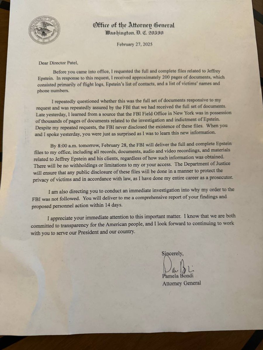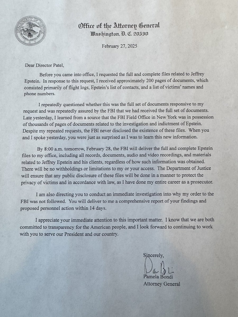 PAM BONDI ON EPSTEIN: THE AMERICAN PEOPLE HAVE A RIGHT TO KNOW EVERYTHING “We released about 120 pages of documents. And I started asking for these documents right when I came into office and before Kash Patel was in there. I ended up getting about 120 pages. We carefully redacted them, of course, to be sure that the personal information of the 254 young girls and women who are victims of sex crimes and sex trafficking was redacted to protect them. I kept saying there has to be more. I get assured that's it. Kash asks the same questions and gets assured there's no more. This week, a source told me the Southern District of New York is sitting on thousands of pages of documents regarding Epstein. You've seen the very strong letter [I sent to FBI Director Kash Patel]. We will get everything. We will redact it, of course, to protect grand jury information and confidential witnesses. But the American people have a right to know. And Donald Trump is the most transparent president in our nation's history. So not only will America get the full Epstein files, they will get JFK, they will get Martin Luther King.” Source: Fox News, February 27, 2025