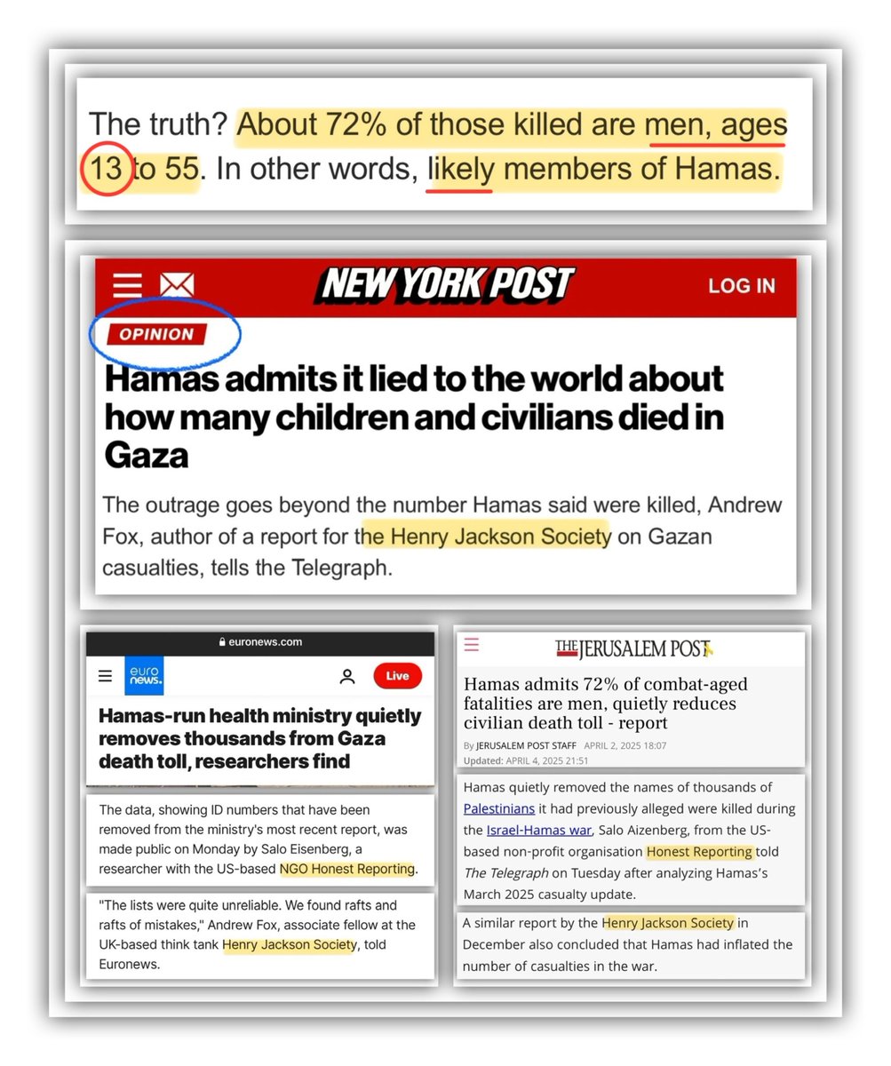 WHO IS BEHIND FALSE CLAIM: HAMAS LIED ABOUT CIVILIAN DEATH TOLL?🧵 NYPost, JPost & EuroNews are spreading Israeli Hasbara claiming 13YR OLD BOYS MURDERED BY ISRAEL ARE SAME AS HAMAS MEN All cite the same 2 ZIONIST FUNDED/MANAGED NGOs: -The Henry Jackson Society -HonestReporting