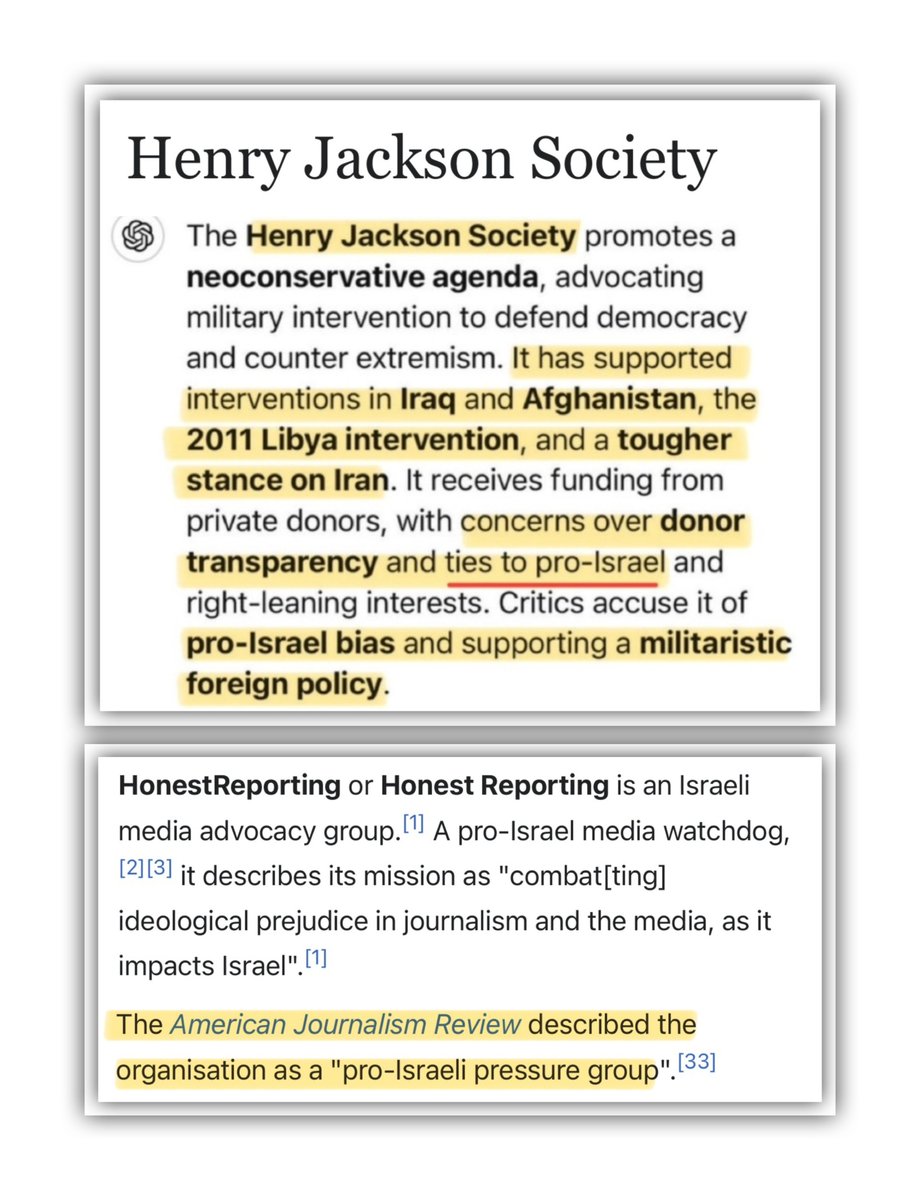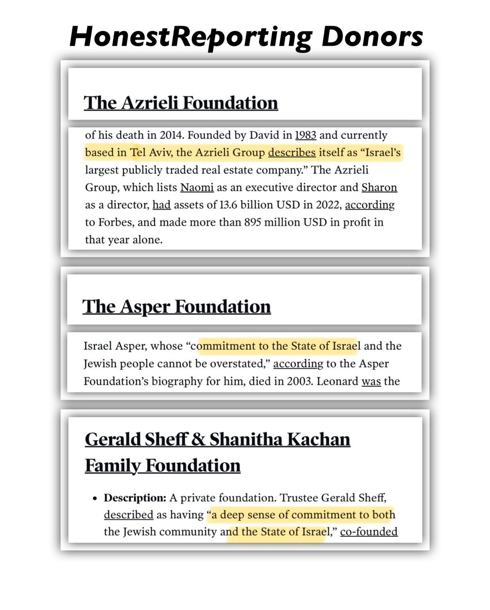 Sources: Zionist Publications Spreading Israeli Propaganda https://www.euronews.com/2025/04/03/hamas-run-health-ministry-quietly-removes-thousands-from-gaza-death-toll-researchers-find https://www.jpost.com/israel-news/defense-news/article-848592 https://nypost.com/2025/04/04/opinion/hamas-admits-it-lied-about-how-many-gaza-children-civilians-died/ HonestReporting: History of False Accusations https://www.reuters.com/world/middle-east/israeli-advocacy-group-accepts-news-outlets-had-no-prior-warning-hamas-attack-2023-11-10/ https://en.wikipedia.org/wiki/HonestReporting HonestReporting Donors https://www.justpeaceadvocates.ca/honest-canada-who-are-the-donors/ https://www.readthemaple.com/here-are-honestreporting-canadas-billionaire-and-millionaire-funders/ The Henry Jackson Society https://www.theguardian.com/environment/earth-insight/2014/may/07/henry-jackson-society-neocon-militarism-mideast-oil-gas-energy https://en.m.wikipedia.org/wiki/Henry_Jackson_Society https://bridge.georgetown.edu/research/factsheet-henry-jackson-society/ https://powerbase.info/index.php/Henry_Jackson_Society:_Project_for_Democratic_Geopolitics#Financial_statements Henry Jackson Society Donors https://www.influencewatch.org/non-profit/the-henry-jackson-society-hjs/ https://www.influencewatch.org/non-profit/donorstrust/ https://www.guidestar.org/profile/31-1642430