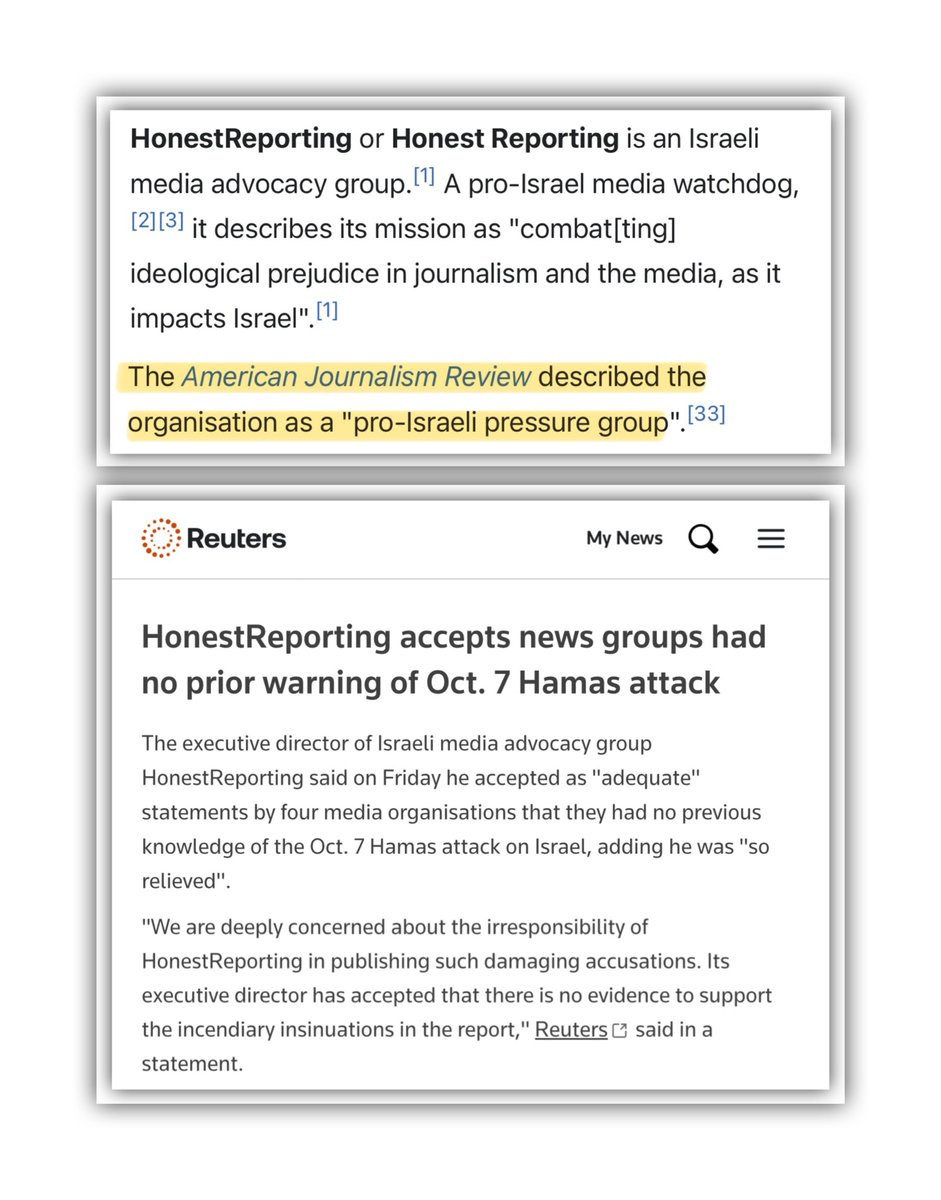 Not so HonestReporting is a Pro-Israel Media watchdog. Unlike other watchdogs whose goal is to correct facts, HonestReporting’s goal is to spread Israeli propaganda. The American Journalism Review called them a “pro-Israel pressure group”. They also falsely accused journalists working for Reuters, AP, CNN & NYT of being part of the Hamas attacks. When it was debunked, they issued an Israeli apology which is basically deflecting. Their list of Zionist donors is massive. You can look here. https://www.readthemaple.com/here-are-honestreporting-canadas-billionaire-and-millionaire-funders/