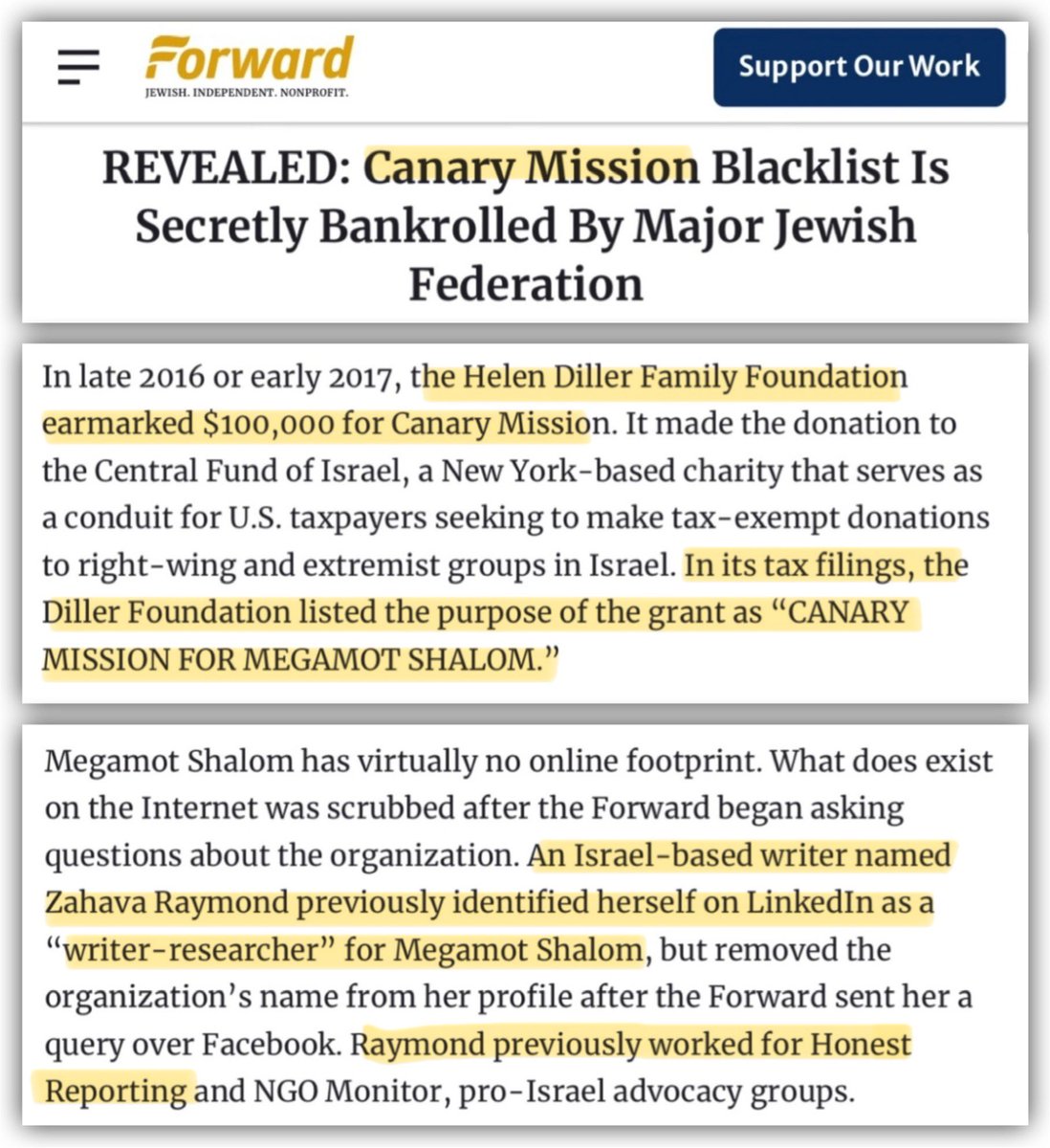 Interestingly, when I research Pro-Israel orgs, I always find they all work within a network & employees hope from one org to another. Case in point, this employee who works for Megamot Shalom (the org that runs Canary Mission in Israel) also worked for HonestReporting. https://t.co/9cCCtsavQV