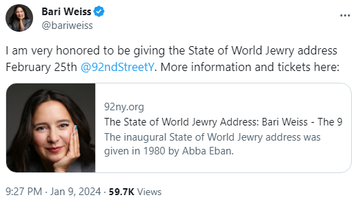 in October cultural center 92nd Street Y cancelled a talk by acclaimed Pulitzer-prize winning author Viet Thanh Nguyen for opposing the Gaza genocide. Staff of the center resigned in protest. Now they have announced their keynote speaker for February: Genocidal maniac Bari Weiss https://t.co/99ZPof84pW