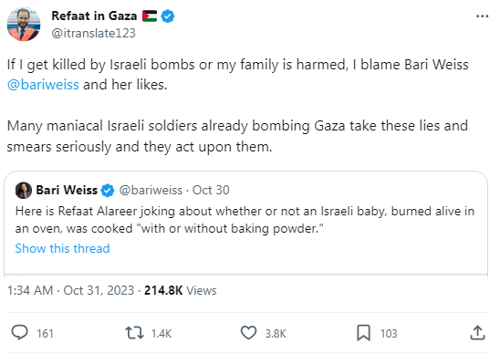 this comes shortly after Bari Weiss put a kill target on Refaat Alareer and successfully got him and his family members, including children, assassinated. Refaat himself said that if anything happens to him and his family he blames Bari Weiss: https://t.co/RXV7IzSLAq