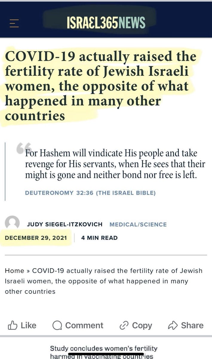 🧵Thread🧵Post 7🧵 “The spike protein produced by either the mRNA vaccine or infection with COVID appears to have been engineered to spare JËŴŞ and harm Europeans. Also, notice that Israel continues to enjoy a high birth rate, unlike White countries.” Here is a video of RFK talking about how COVID-19 can be used as a bio-weapon with certain races. “Targeted for caucasians and black people. The people most immune are Ashkenazi JËŴŞ and Chinese people” Probably just a Coincidence right?