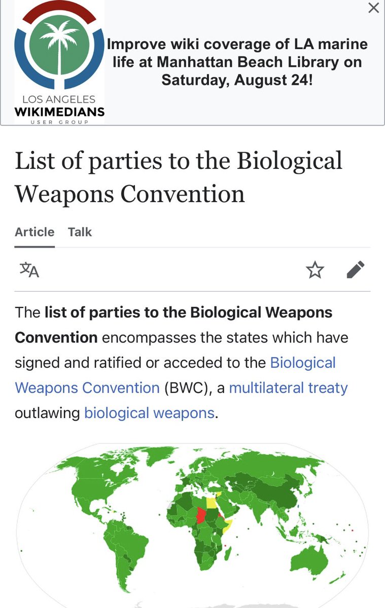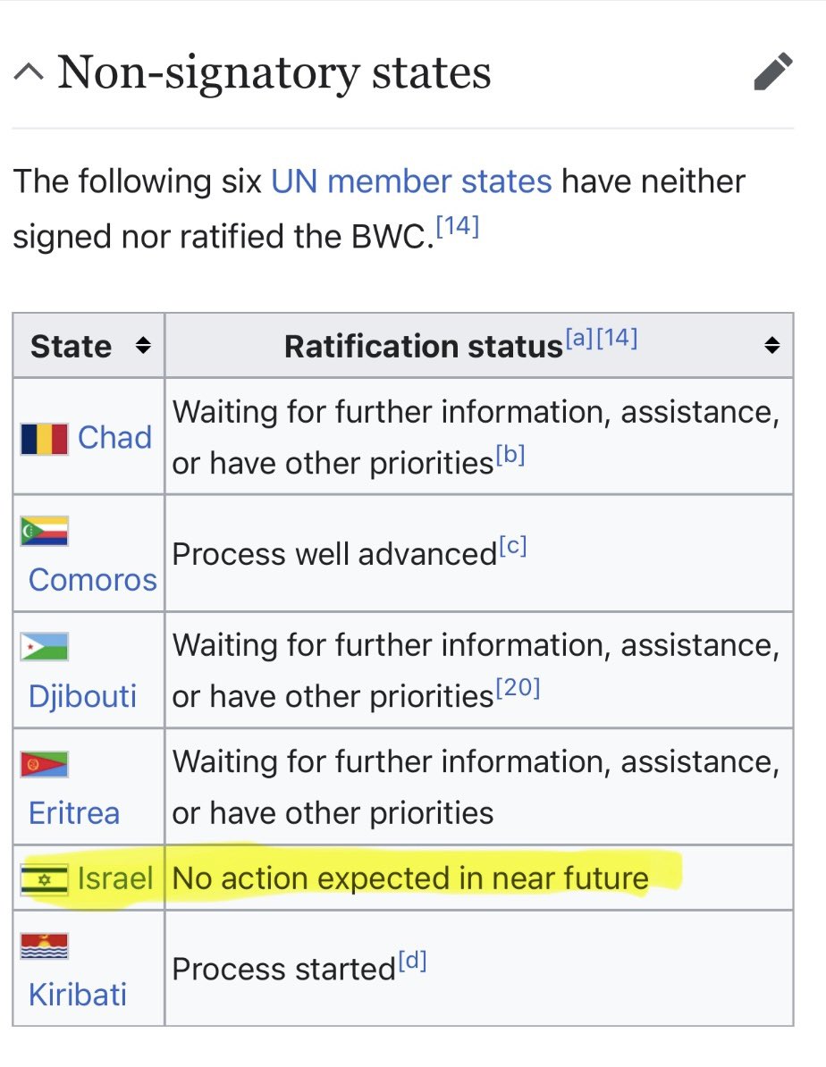 🧵Thread🧵Post 5🧵 “The Biological Weapons Convention (BWC), or Biological and Toxin Weapons Convention(BTWC), is a disarmament treaty that effectively bans biological and toxin weapons by prohibiting their development, production, acquisition, transfer, stockpiling and use. The treaty's full name is the Convention on the Prohibition of the Development, Production and Stockpiling of Bacteriological (Biological) and Toxin Weapons and on their Destruction.” You can guess who never signed nor ratified the agreement. 🇮🇱