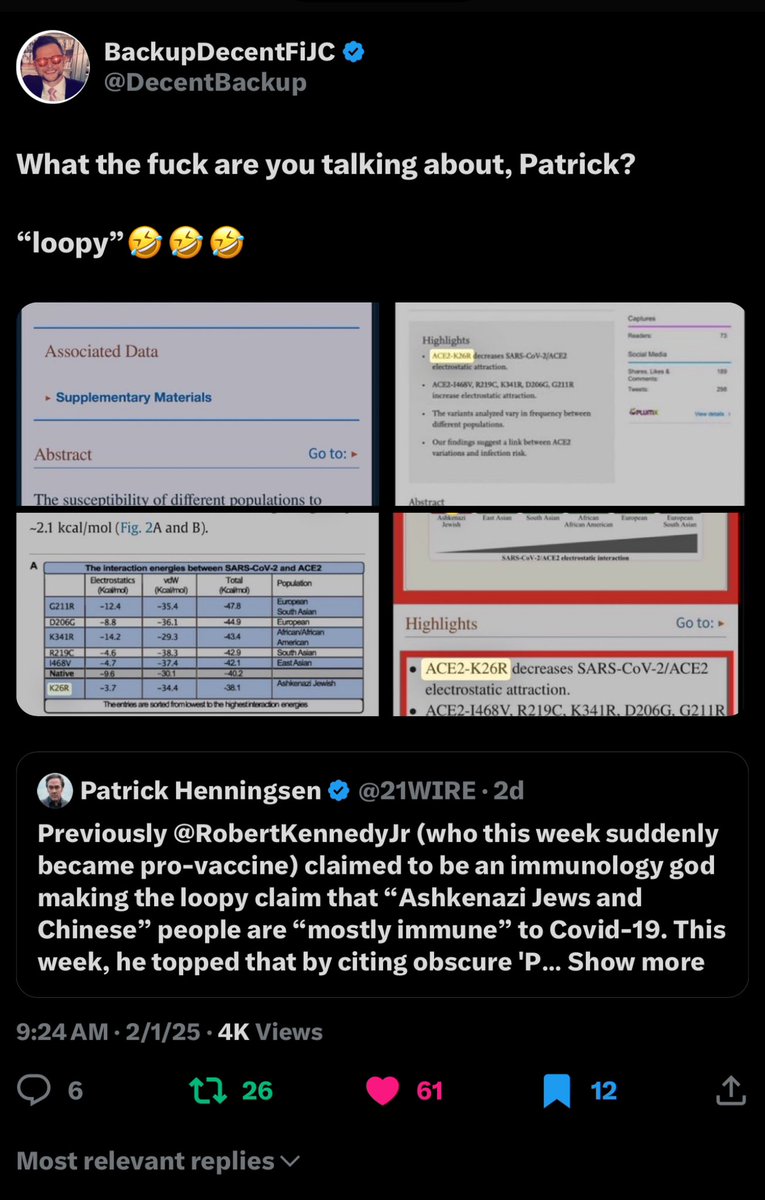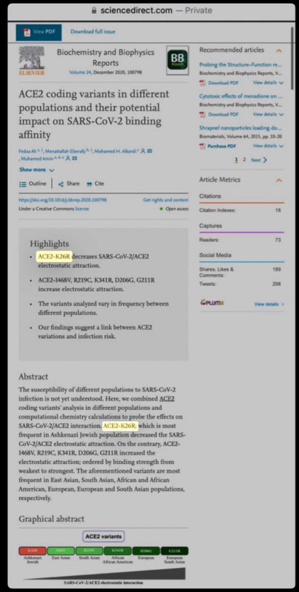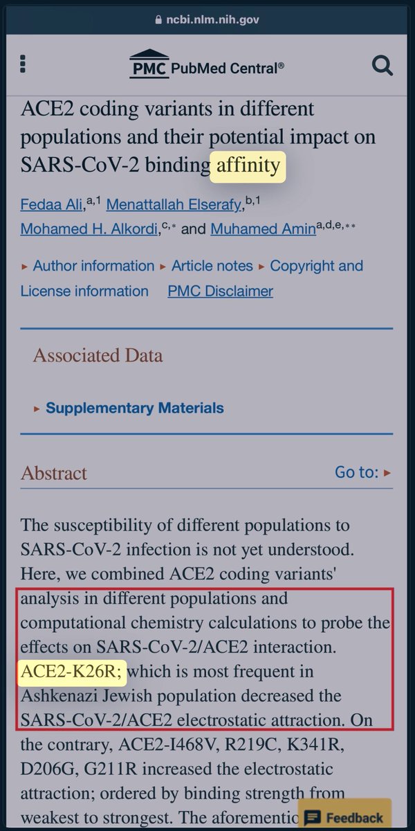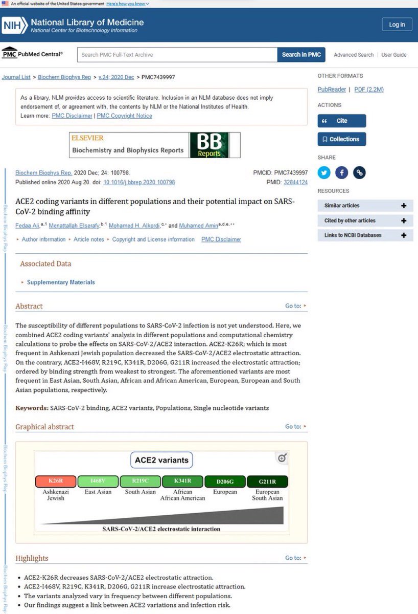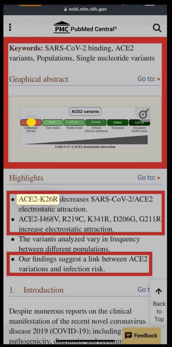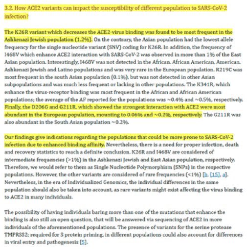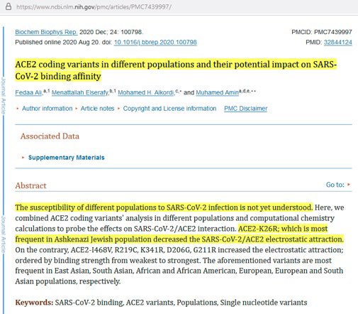 🧵Thread🧵Post 6🧵 “There have been numerous studies that looked at COVID and susceptibility among various groups, including ethnic groups.” “Several studies found that Ashkenazi JËŴŞ were the least likely to be affected. Ashkenazis account for over 80% of global jewry.” “Your ACE2 enzyme acts like a doorway for viruses to enter your cells. The COVID spike protein is designed to seek out your ACE2 receptor. It goes straight for it.” “If your ACE2 has certain genetic variants, the covid spike protein will gain entry access into your cell and begin replicating.” “Interestingly enough, one large study that looked at 81,000 genomes discovered that Ashkenazi JËŴISH populations didn’t appear to carry these deleterious variants at all.”