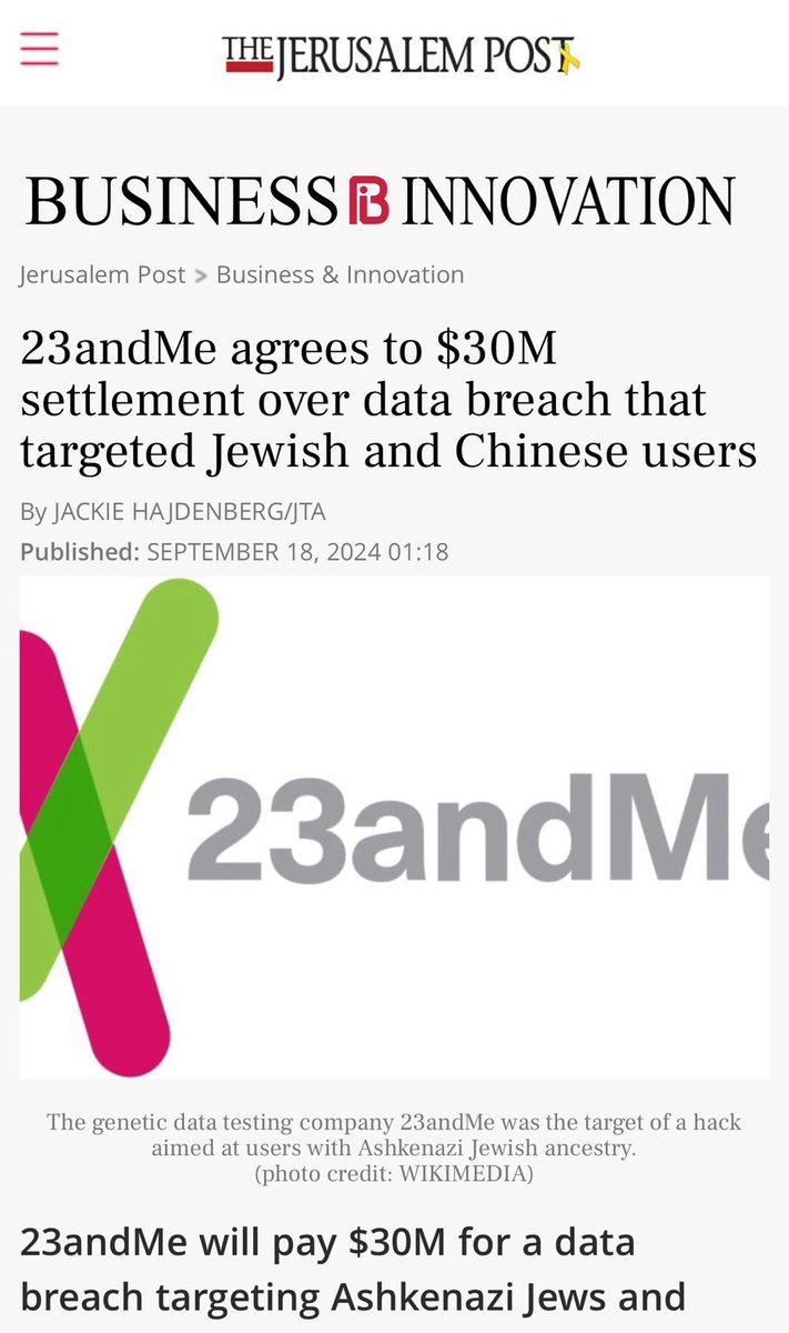 🧵Thread🧵Post 9🧵 “Referring to the video above “the Amish do not participate in sending their DNA into organizations like 23 and Me.” The founders of major DNA genetic ancestry US companies are 🔯’s: -23andMe: Anne Wojcicki 🔯 -MyHeritage DNA: Gilad Japhet 🔯 -Family Tree DNA: Bennett Greenspan 🔯 *These companies add fake African and JËŴISH ancestry to White profiles to reduce "antisemitism, racism.” *23andMe independent board members resigned in a feud over CEO Anne Wojcicki’s plan to take company private, one of of three sisters including Susan Wojcicki, former CEO of YouTube and Janet Wojcicki, an anthropologist and epidemiologist. *23andMe, which allows consumers to test for ancestry and health risks. *+23andMe has agreed to pay a $30 million settlement for a class action suit that claimed the company failed to alert Chinese and Ashkenazi JËŴISH customers that the DNA testing data breach seemed to target their data in particular. The suit alleged those customers’ data had been compiled into lists that were sold on the dark web. *@Truthtellerftm & pics