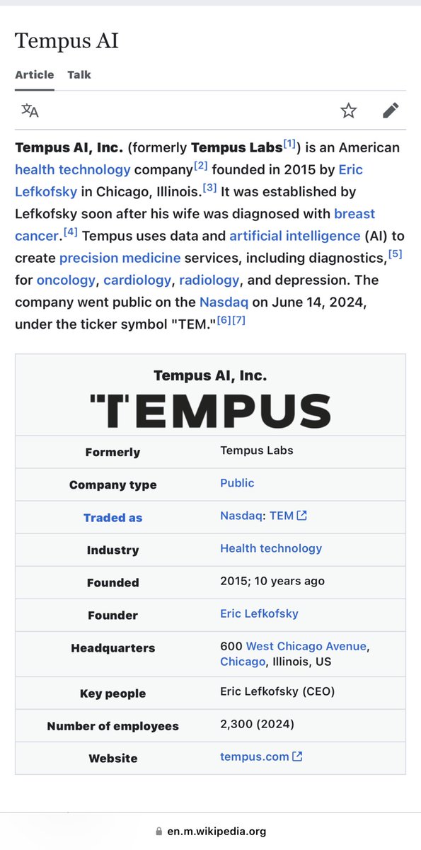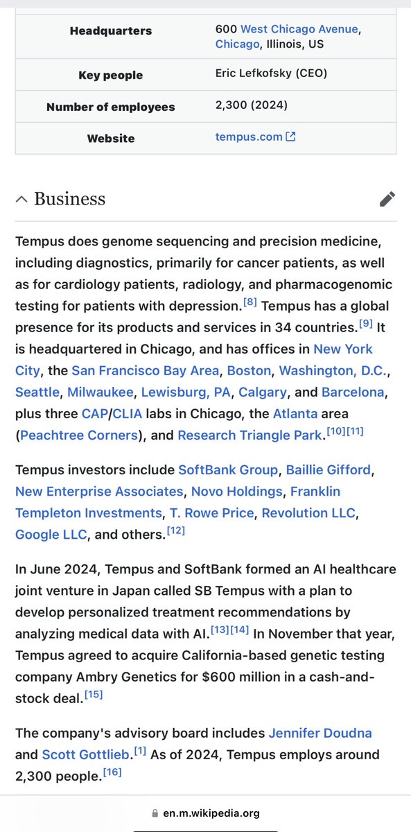 I know most TEMPUS advisors by heart, @Amy31129057: Eric Topol (Scripps) Peter Barris Scott Gottlieb (FDA/Pfizer/Illumina/Alex. Brown) David R. Epstein (Seagen) Wayne AI Frederick (Blackstone/BCG/Save the Children) Jennifer Doudna (CRISPR CAS-9) *Lots of NVIDIA, Bain, etc. too. https://t.co/tWrCYfTtbB