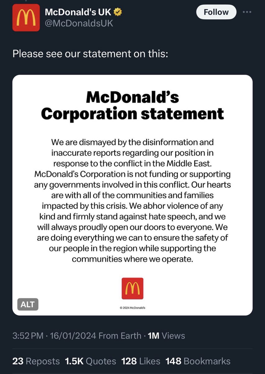 MCDONALD’S UK STATEMENT AFTER MAJOR IMPACT AFTER BOYCOTTS bUt bOyCoTt dOeS nOt wOrK https://t.co/fvUnJ2Pnf3
