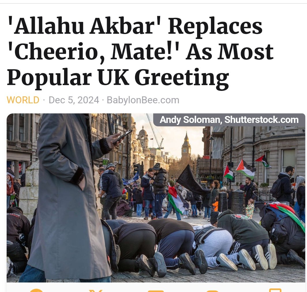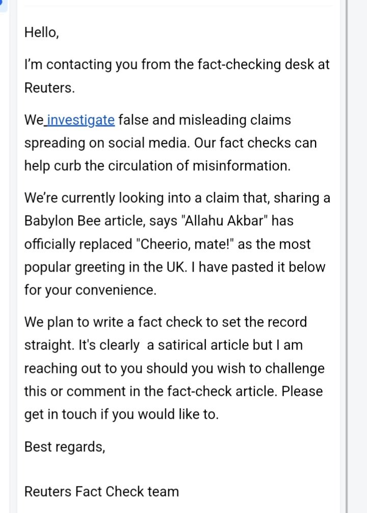 Reuters fact-checkers reached out for comment on our @TheBabylonBee story about 'Allahu Akbar' replacing 'Cheerio Mate' in the UK. I tried to help them out. https://t.co/obHm9qB7cG