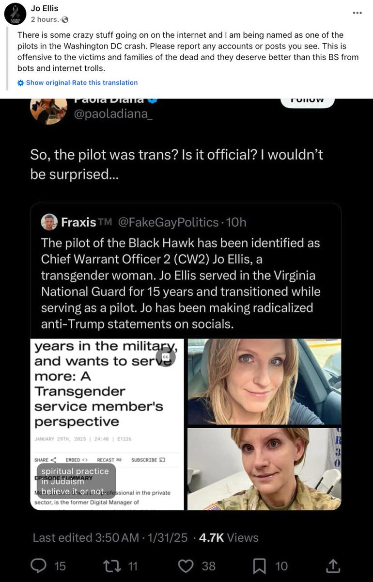 🇺🇸 Jo Ellis, the transgender Black Hawk pilot: “I understand some people have associated me with a the crash in DC and that is false. It is insulting to the families to try to tie this to some sort of political agenda. They don't deserve that. I don't deserve this.” https://t.co/ENWTlLWJ35