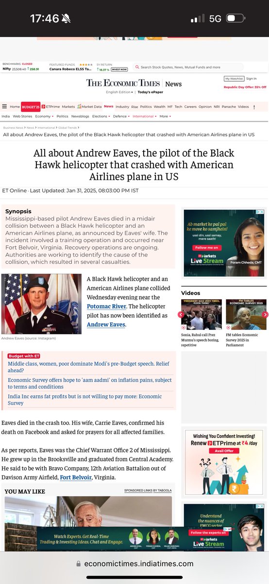 Eaves died in the crash too. His wife, Carrie Eaves, confirmed his death on Facebook and asked for prayers for all affected families. As per reports, Eaves was the Chief Warrant Office 2 of Mississippi. He grew up in the Brooksville and graduated from Central Academy. He said to be with Bravo Company, 12th Aviation Battalion out of Davison Army Airfield, Fort Belvoir, Virginia. The helicopter, part of the 12th Aviation Battalion at Davison Army Airfield in Fort Belvoir, Virginia, was on a training mission when it collided with American Airlines Flight 5342. The plane, originating from Wichita, Kansas, was attempting to land when the collision occurred just before 8 p.m. The helicopter carried three troops, and the plane had 64 people on board.