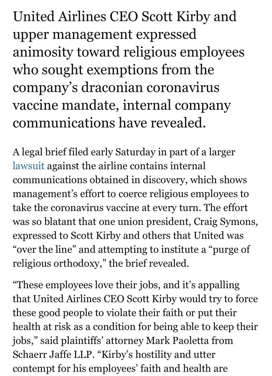 .@united is being sued now for their draconian vax mandates. The lawsuit alleges the CEO attempted to institute a “purge of religious orthodoxy,” “mocked and shamed” people who didn’t want to get vaxed and expressed animosity towards those with religious exemptions. As I previously reported, the CEO who is also a drag queen said he hires based on diversity quotas. Tough week for @united!