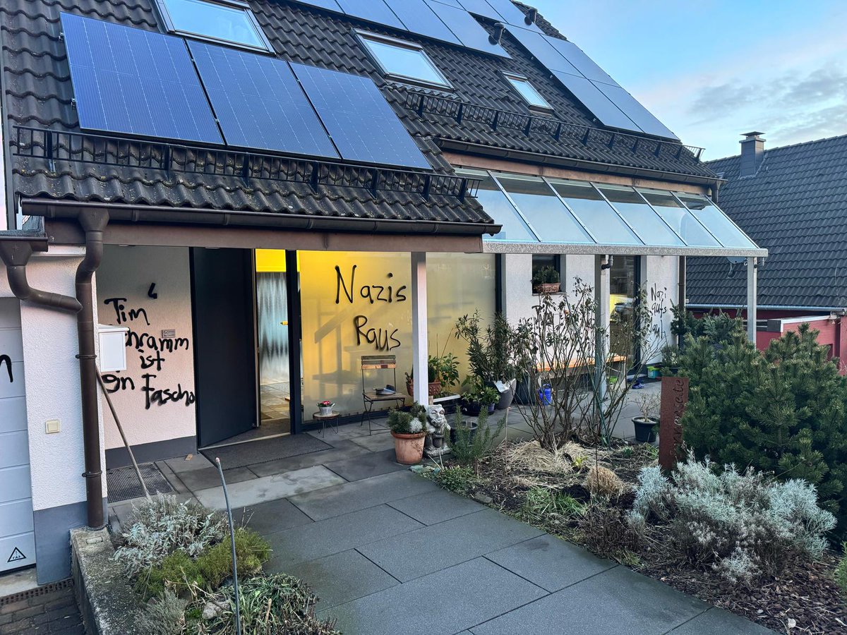 This is the sad truth about freedom of speech in Germany. The family home of Tim Schramm, a young campaigner for the AfD in Wuppertal, was vandalized overnight by state-funded and supported thugs. Everyday life in our 'democracy.' I thank @JDVance/@VP and @elonmusk for their support! Freedom is not lost, but it is under attack!